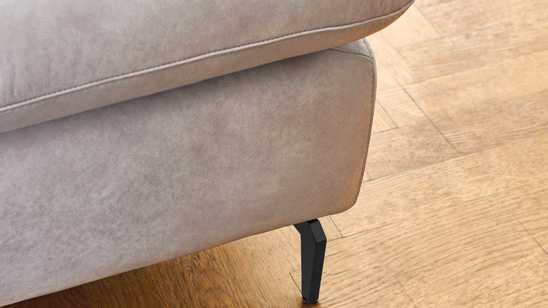 Der Funktionshocker aus der W.SCHILLIG Polsterserie Select Venus plus kombiniert einen edlen hellgrauen Lederbezug mit mattschwarz ...