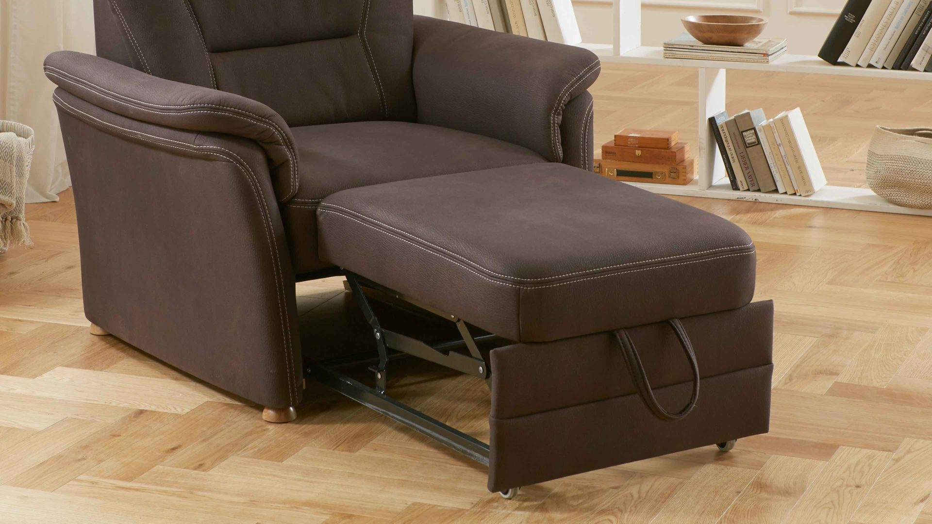 Bei der Auszugsfunktion handelt es sich um einen angenehmen Funktions-Mehrpreis für die Sessel aus dem Modulmaster-Polsterprogramm MM-PP1067. Der manuell ausziehbare Hocker lädt Sie ein, Ihre Beine bequem auszustrecken, um noch mehr zu entspannen. Seine Maße belaufen sich auf ca. 64 x 49 cm (BxL).