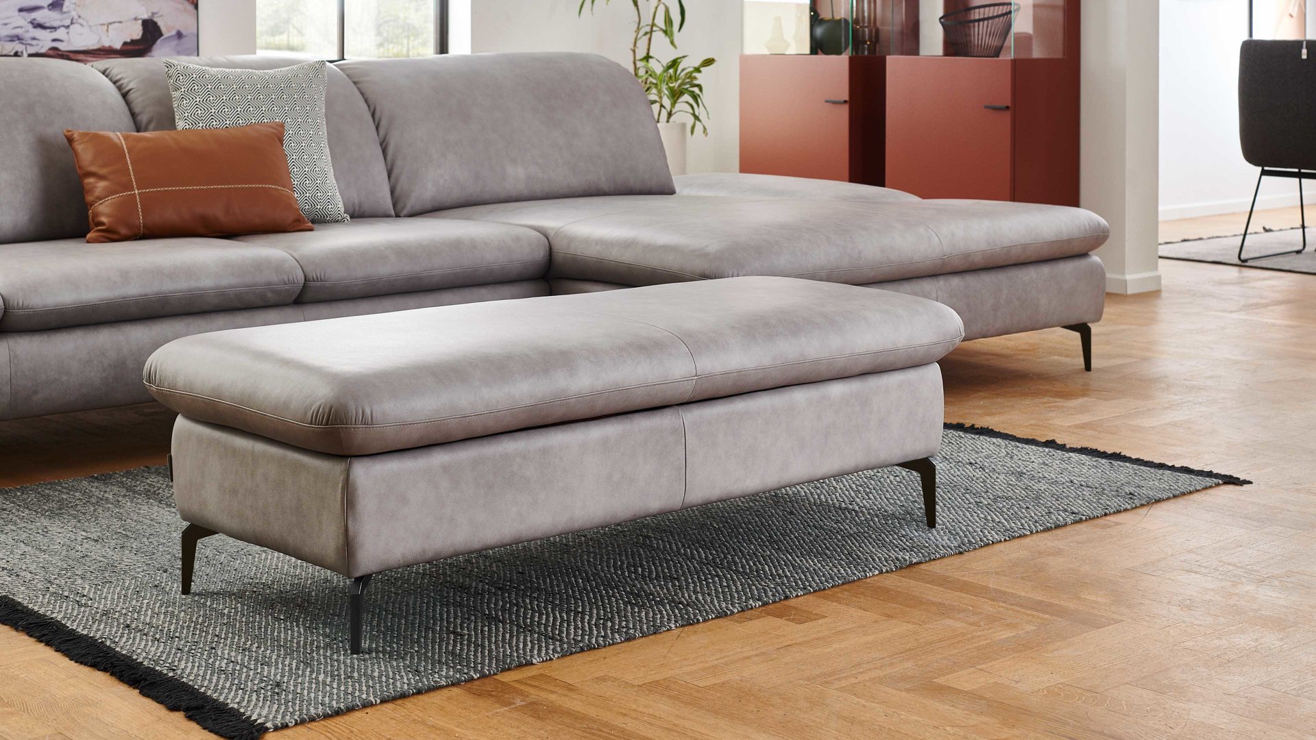 Der Hocker aus der W.SCHILLIG Polsterserie Select Venus plus kombiniert einen edlen hellgrauen Lederbezug mit mattschwarz pulverbeschichteten ...