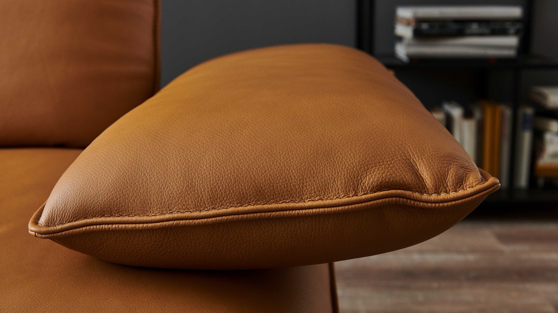 Besonders hervorzuheben sind die Funktionsrücken und die Sitztiefenverstellung des Sofas. Durch die zweifach verstellbare Rückenlehne mit eingearbeiteten Metallgelenken kann die Sitztiefe um bis zu 29 cm vergrößert werden. Dadurch erreicht das Ledersofa eine Gesamttiefe von ca. 113 cm. Durch das Umklappen der Rückenlehne nach hinten verringert sich die Gesamthöhe um bis zu 30 cm, während sich die Gesamttiefe um weitere ca. 34 cm vergrößert.