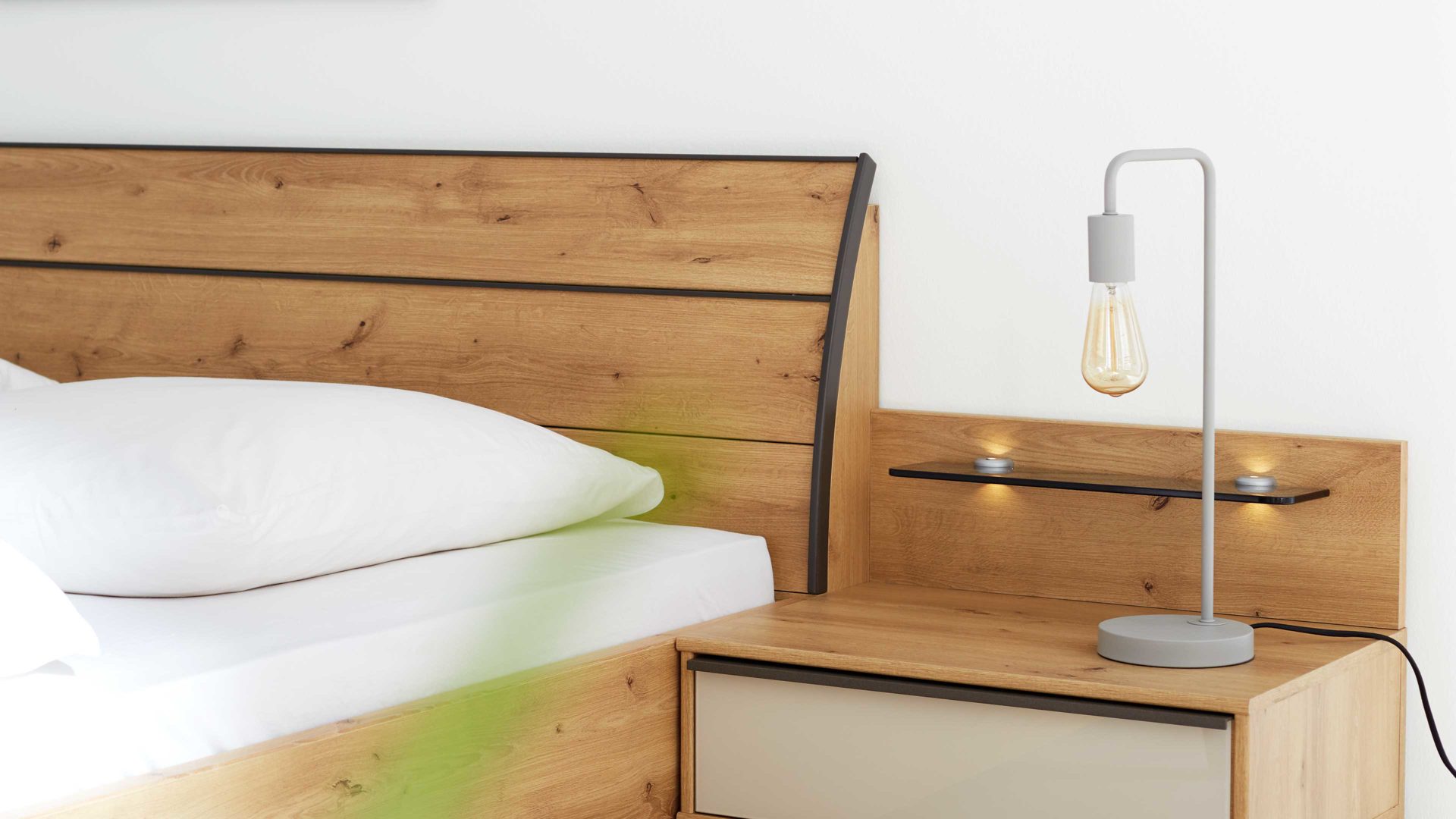 Alles aus einer Serie: Ergänze deinen Schrank mit einem passenden Bettgestell – wahlweise mit Polster- oder Holzkopfteil. Mit sieben Breiten und vier Längen entsteht ein harmonisches Schlafzimmerkonzept.