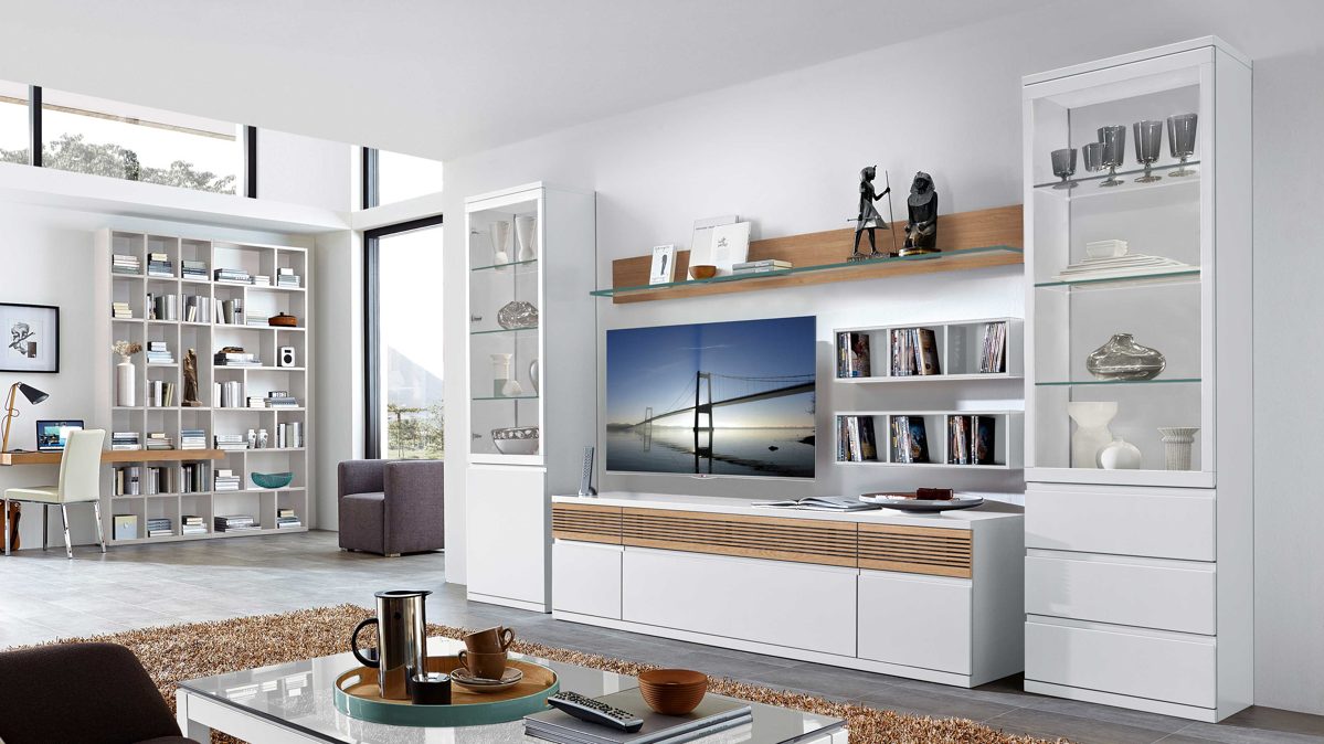 Die Vision Wohnkombination beeindruckt mit mattweißen Lackoberflächen und akzentuierendem Eichefurnier im Farbton Sand. Durch die helle ...