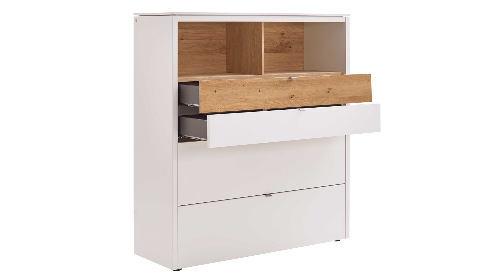 Details Korpus und Fronten mit mattweißer Lackoberfläche Akzente in Balkeneiche   Griffe in Edelstahloptik sichtbare ...