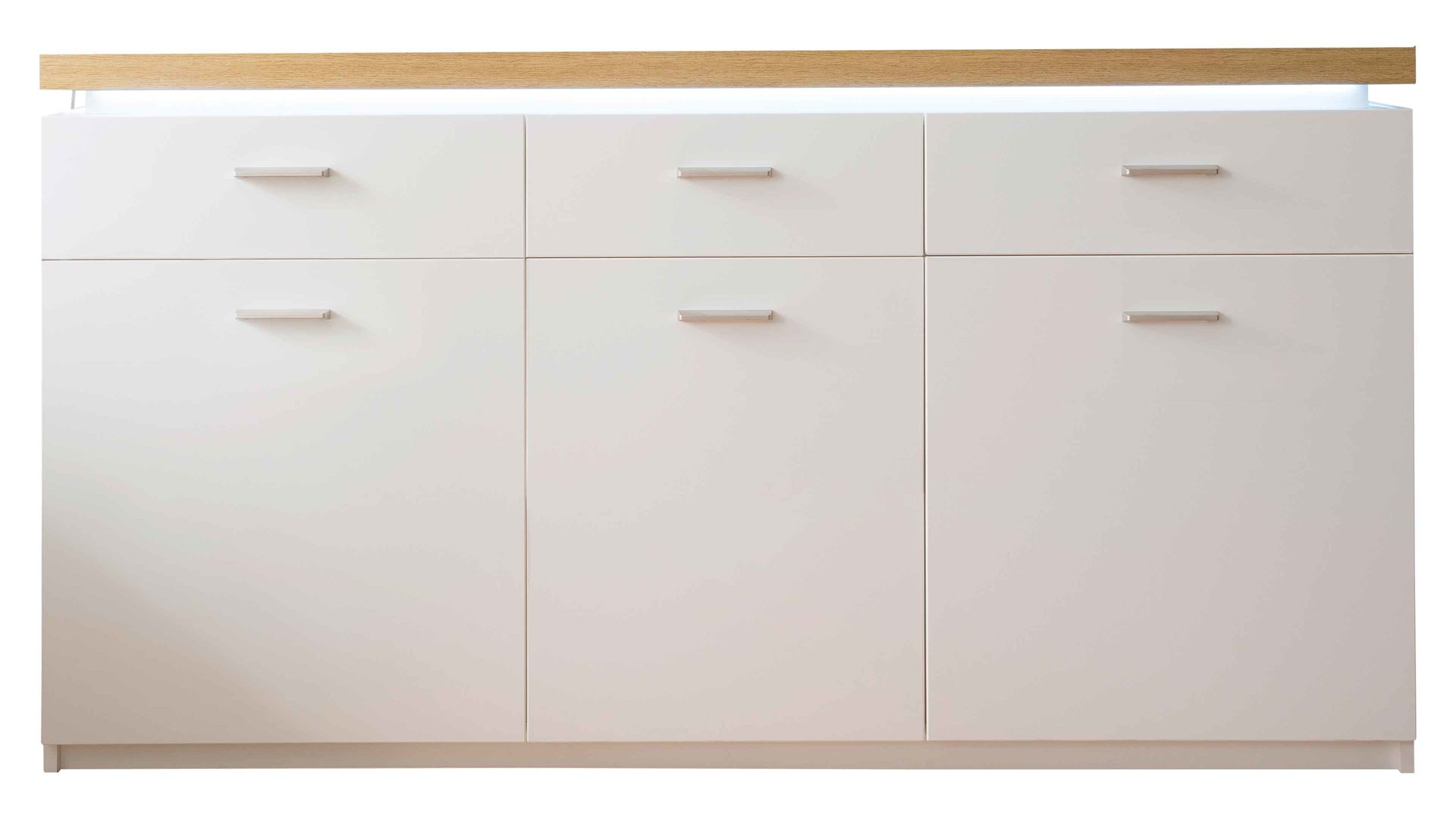 Das Sideboard 01 aus dem modernen Wohnprogramm Cali verbindet kratz- und stoßfeste, weiße Melaminoberflächen mit Wotan Eiche-Nachbildung - und ...