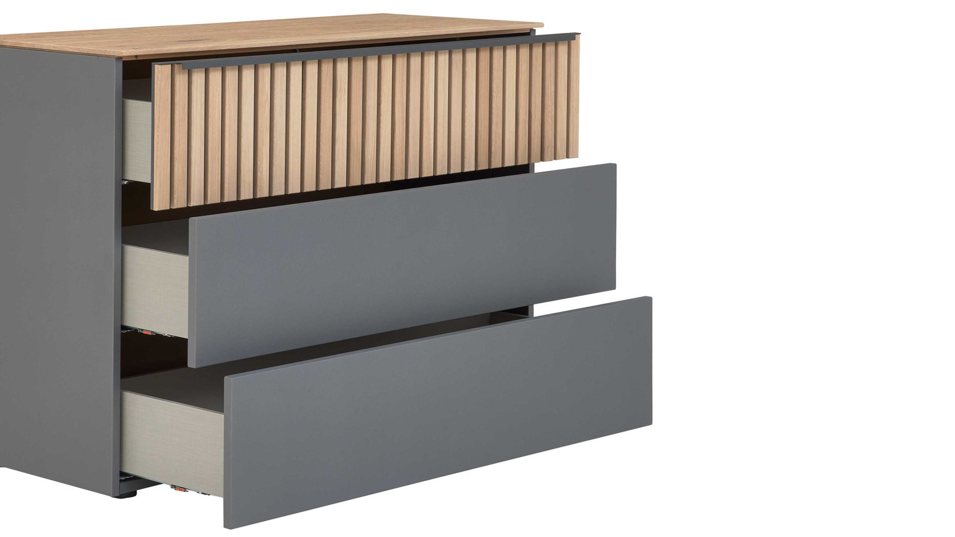 Die Schubladenkommode 528091 aus der Interliving Schlafzimmer Serie 1029 kombiniert graphitfarbenen Lack mit Wildeiche-Massivholz.