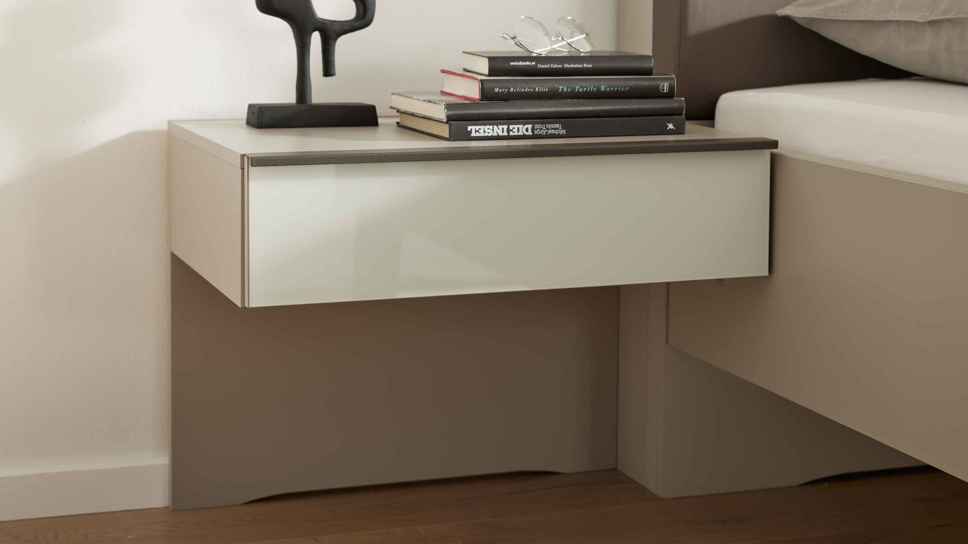 • Die Abbildung zeigt ein Wohnbeispiel, welches auch Dekoration sowie separat erhältliches Zubehör enthält. Im Lieferumfang enthalten sind ein Schwebetürenschrank, ein Bettgestell und zwei Hängekonsolen.