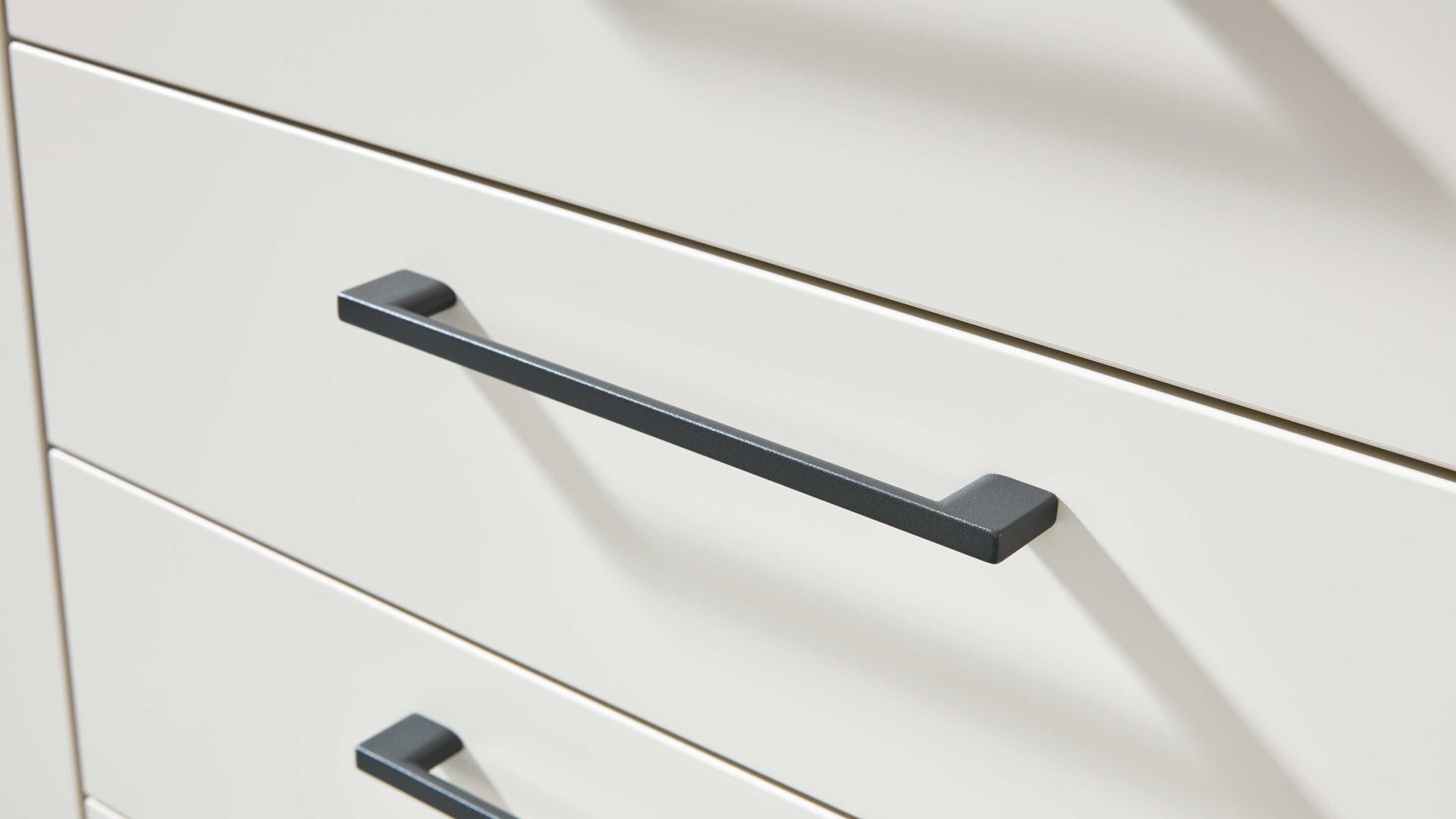 Eine hochwertige, funktionale Kommode, die Ordnung schafft und mit ihrer Kombination aus Holz, Mattlack und Metallgriffen einen modernen Akzent in dein Schlafzimmer bringt.