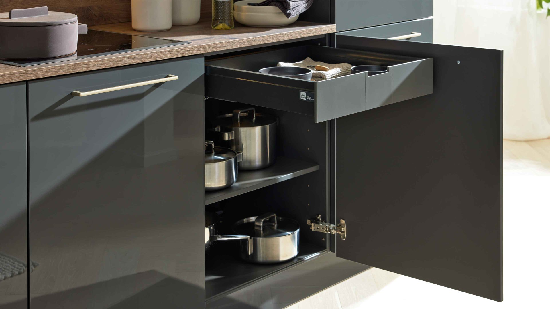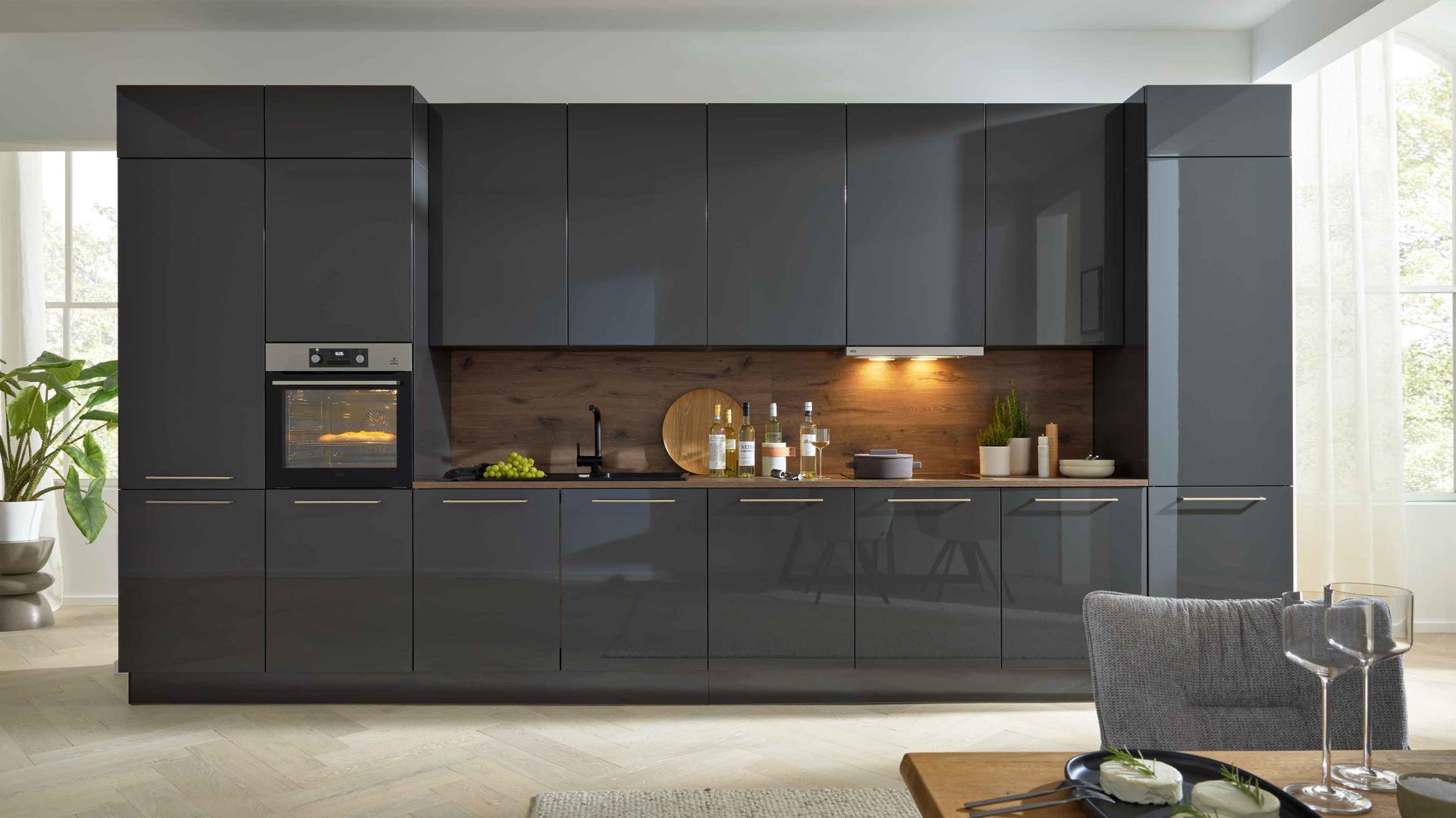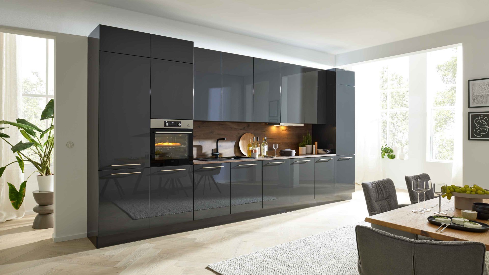 Interliving Küche Serie 3114 – moderne Hochglanzküche in Graphit mit AEG-Einbaugeräten   Stilvolles Design mit edlen Akzenten Die ...