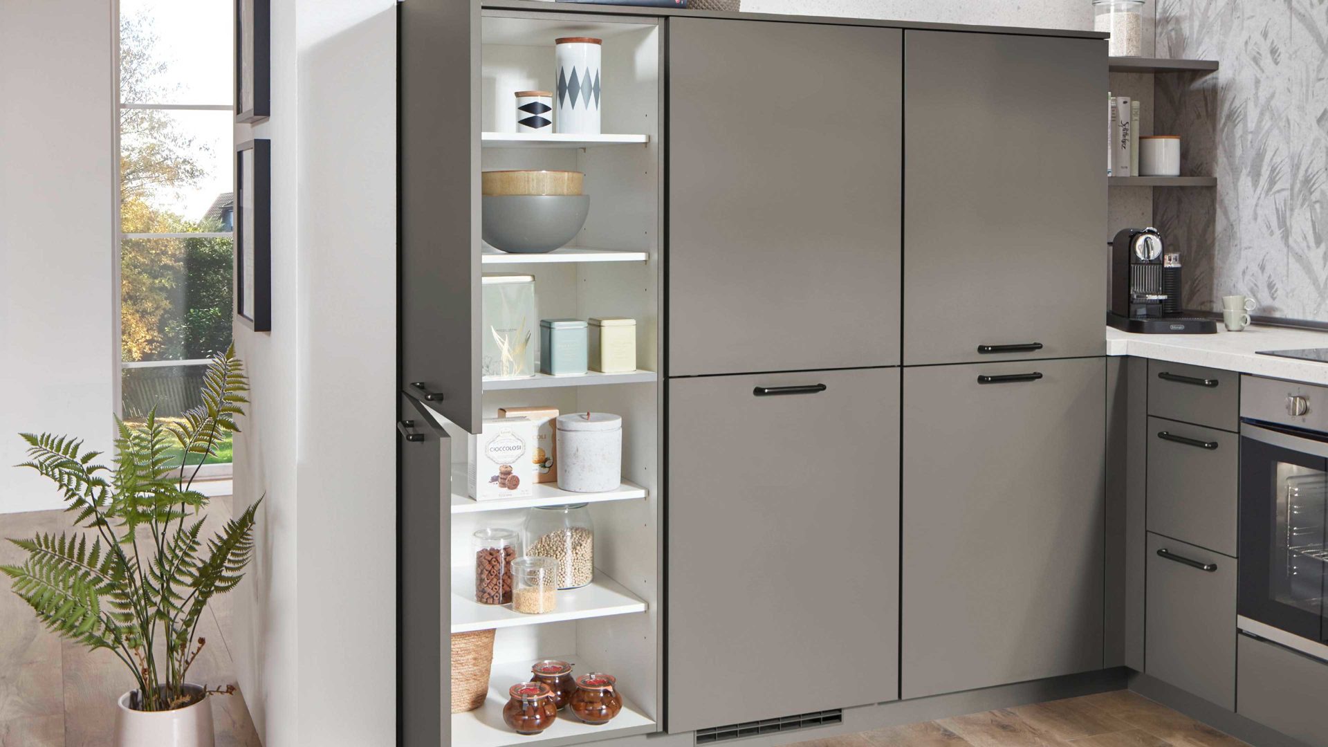 Die nobilia® Einbauküche Laser präsentiert sich in mattem Taupegrau und überzeugt mit einer ruhigen, eleganten Ausstrahlung. Gebürstete anthrazitfarbene Metallgriffe setzen dezente, moderne Akzente. Die Arbeitsplatten in weißer Terrazzo-Nachbildung bringen Frische ins Design und sorgen für einen spannenden, hochwertigen Kontrast.