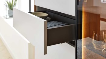 Eine optisch wie funktional begeisternde Eigenschaft der Kommode bilden die grifflosen Fronten mit Push-to-open-Funktion und Türdämpfung. Letztere ermöglicht lautloses Schließen. Den gleichen Vorteil haben die Schubladen: Sie sind mit einer Schließdämpfung ausgestattet. Des Weiteren bringen sie einen praktischen Selbsteinzug mit, der die Handhabung spürbar erleichtert. Die Maße des geräumigen Kommodenschranks belaufen sich auf ca. 143 x 121 x 37 cm (BxHxT). Er beherbergt eine Glas- und zwei Holztüren mit insgesamt zwei Glas- und drei Holzböden sowie zwei flache Schubladen.