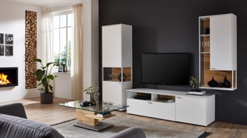 Die dreiteilige Wohnkombination aus dem VENJAKOB Wohnprogramm Sentino 3000 umfasst eine Standvitrine, ein Lowboard und eine Hängevitrine. Sie ...