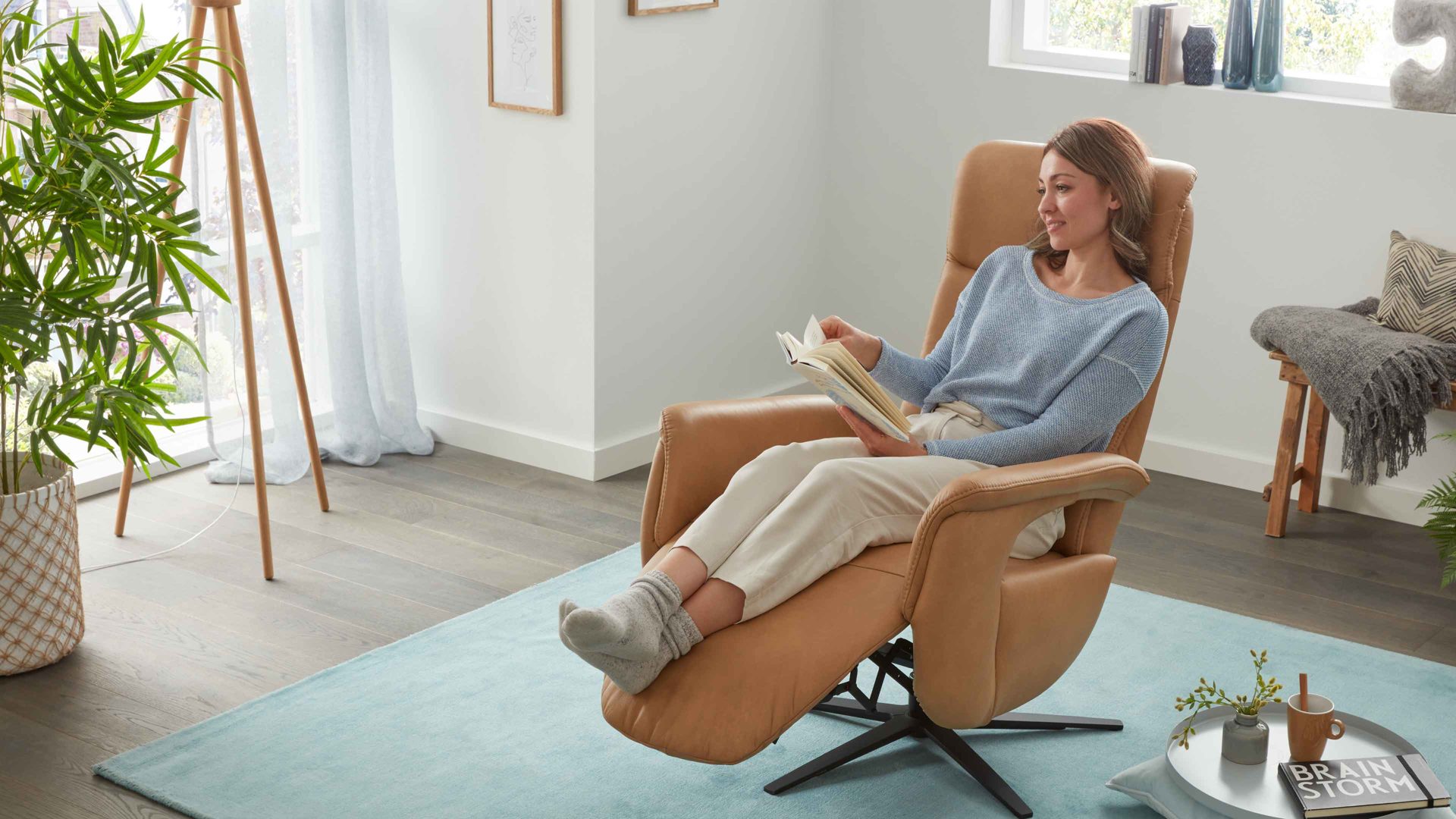 Das praktische Highlight des edlen Ledersessels bildet die manuelle Relaxfunktion: Indem Sie leichten Körperdruck anwenden, senkt sich der Rücken. Dabei geht der Sitz automatisch nach vorne und oben. Gleichzeitig fährt auch die Beinauflage nach oben, bis die Relaxposition erreicht ist.