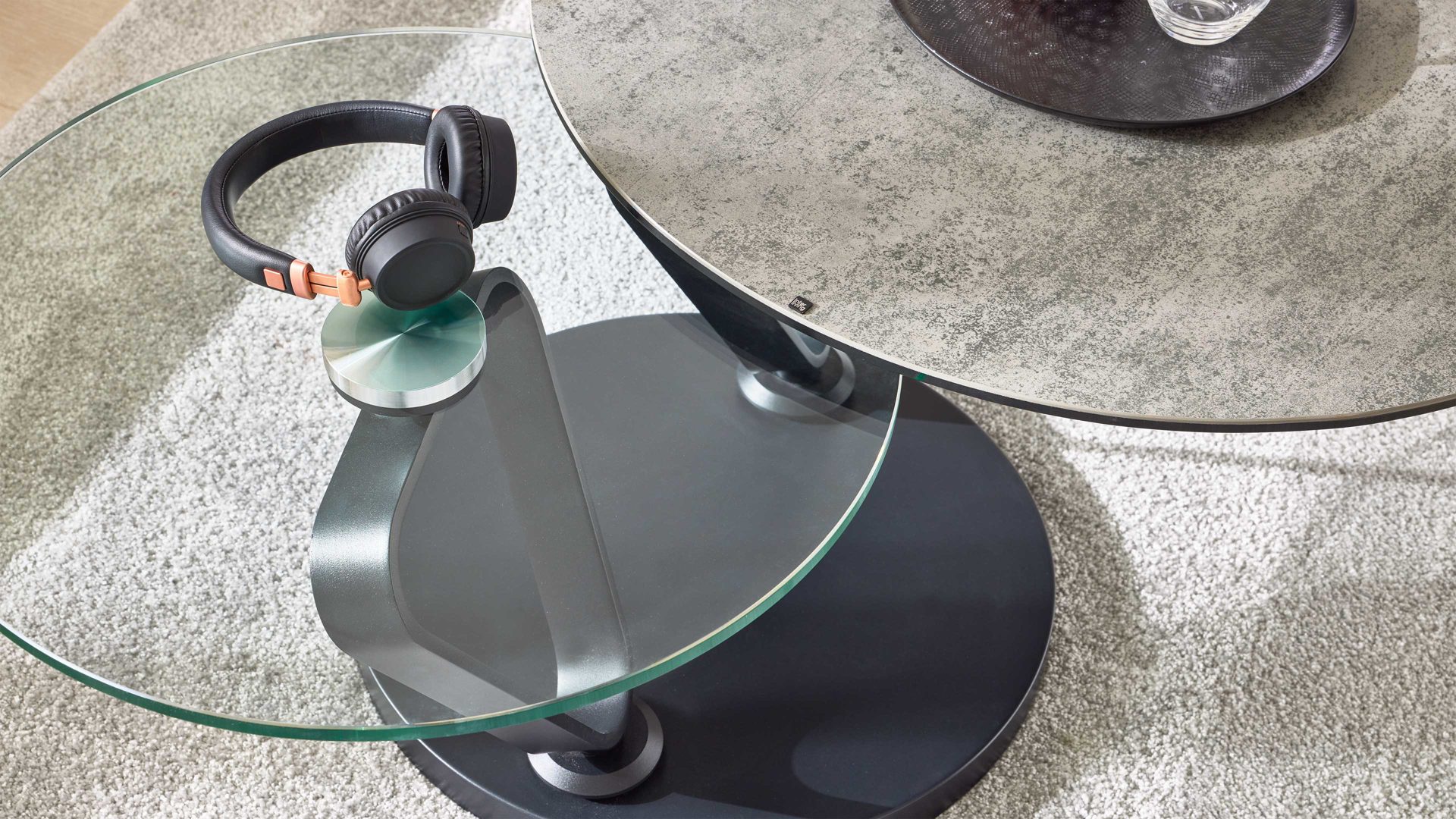 Neben seiner edlen Optik begeistert der Tisch durch seine durchdachte Mechanik. Die 3 mm starke Keramikplatte ist robust, pflegeleicht und äußerst langlebig. Sowohl Keramik- als auch Glasplatte sind schwenkbar, sodass du die Tischfläche flexibel anpassen kannst – perfekt, um sie an unterschiedliche Sitzpositionen oder Nutzungssituationen anzupassen. Je nach Ausrichtung variiert der Durchmesser von ca. 75 cm bis 130 cm, bei einer Höhe von ca. 42 cm. So wird der Tisch zum funktionalen Drehpunkt deines Wohnbereichs und passt sich jeder Raumsituation mühelos an.