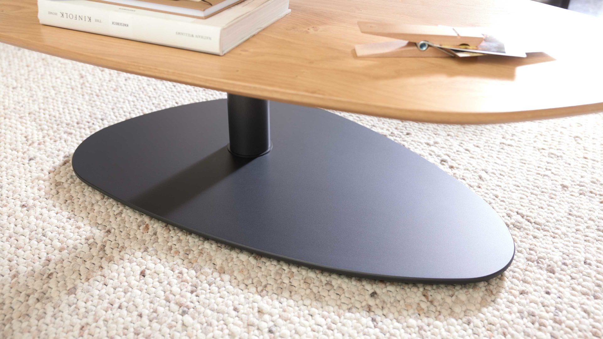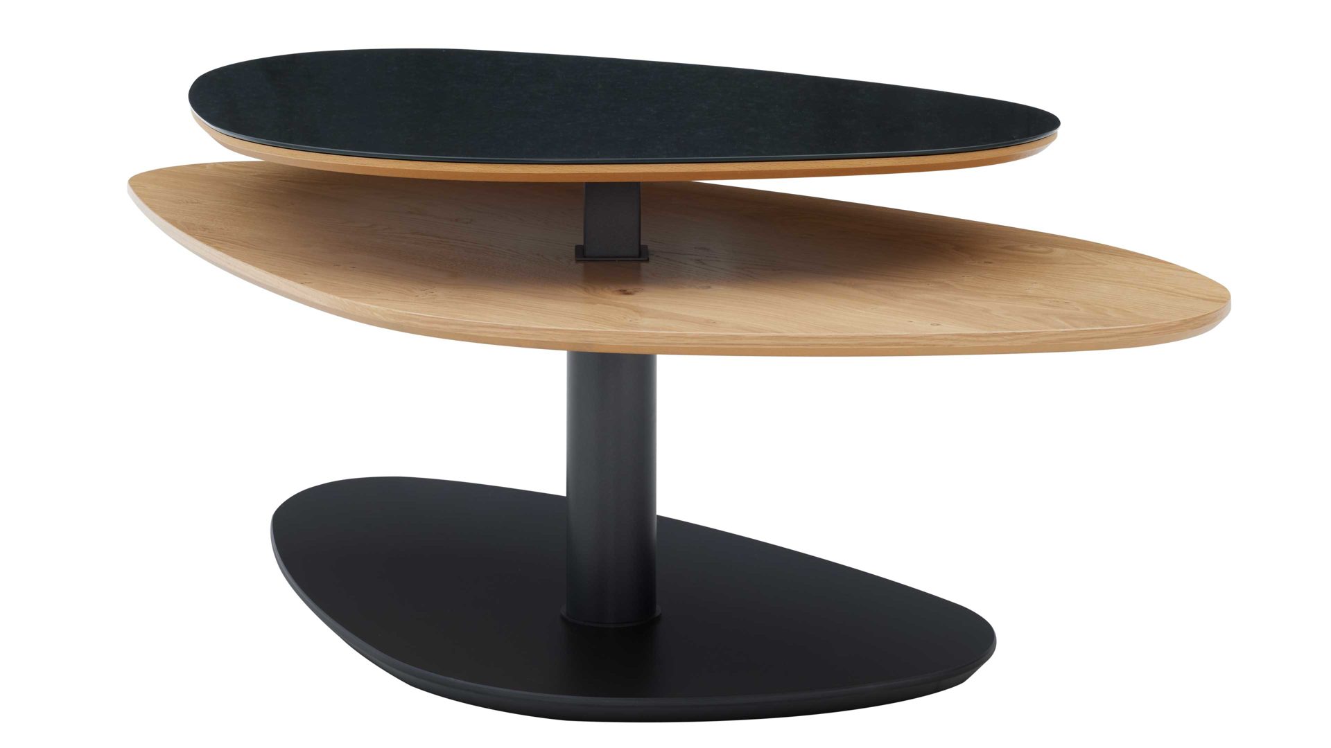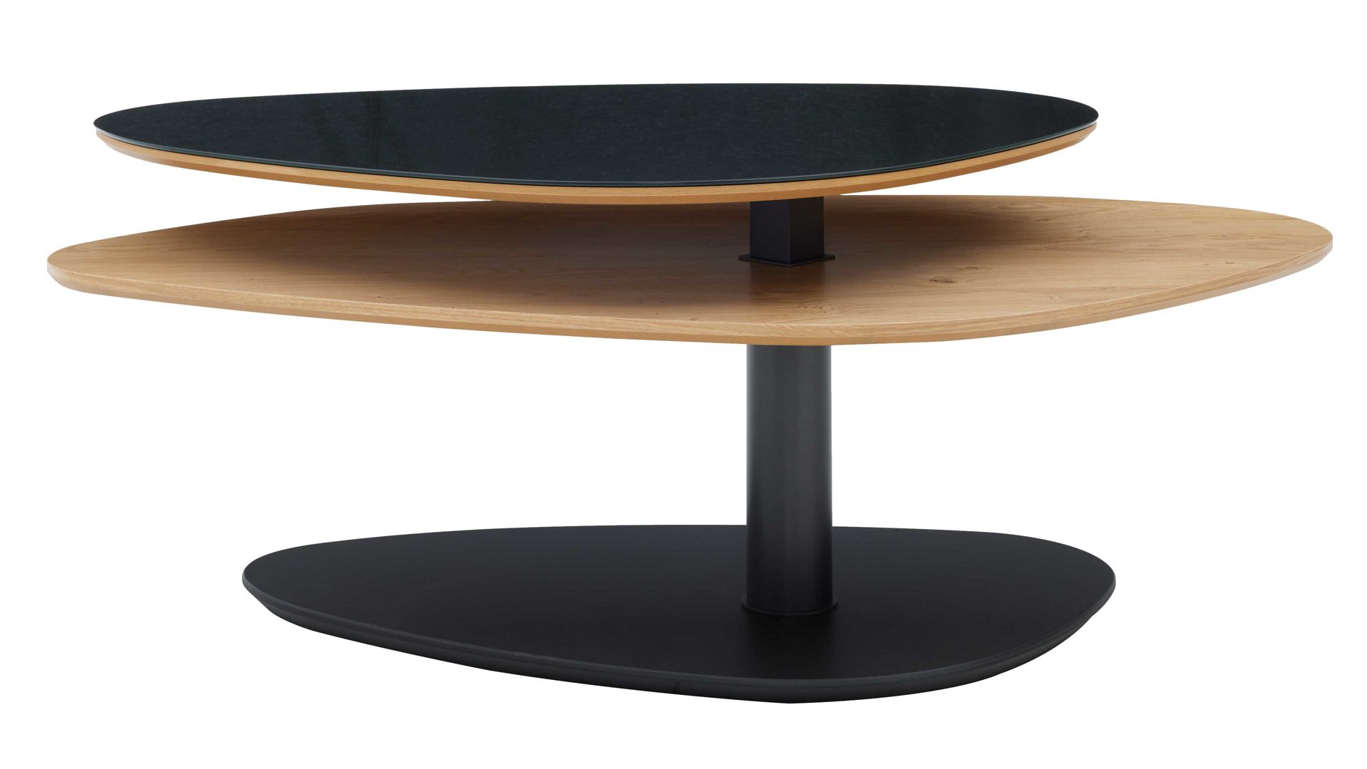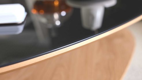 Die Tischplatten mit abgeschrägten Schweizer Kanten unterstreichen die hochwertige Verarbeitung und verleihen dem Tisch eine filigrane, edle Optik. Die Bodenplatte in eleganter Schliffoptik rundet das Design harmonisch ab und sorgt für visuelle Tiefe. Das Ergebnis: ein Couchtisch, der gleichermaßen stilvoll wie funktional ist.
