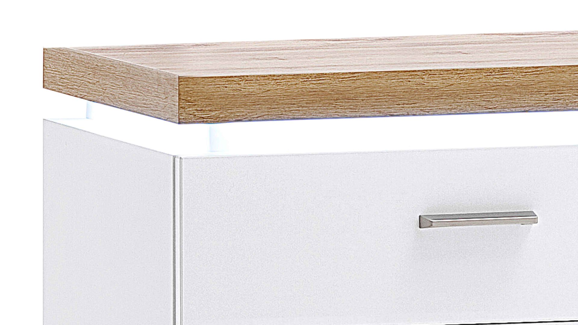 Das Sideboard 01 aus dem modernen Wohnprogramm Cali verbindet kratz- und stoßfeste, weiße Melaminoberflächen mit Wotan Eiche-Nachbildung - und ...