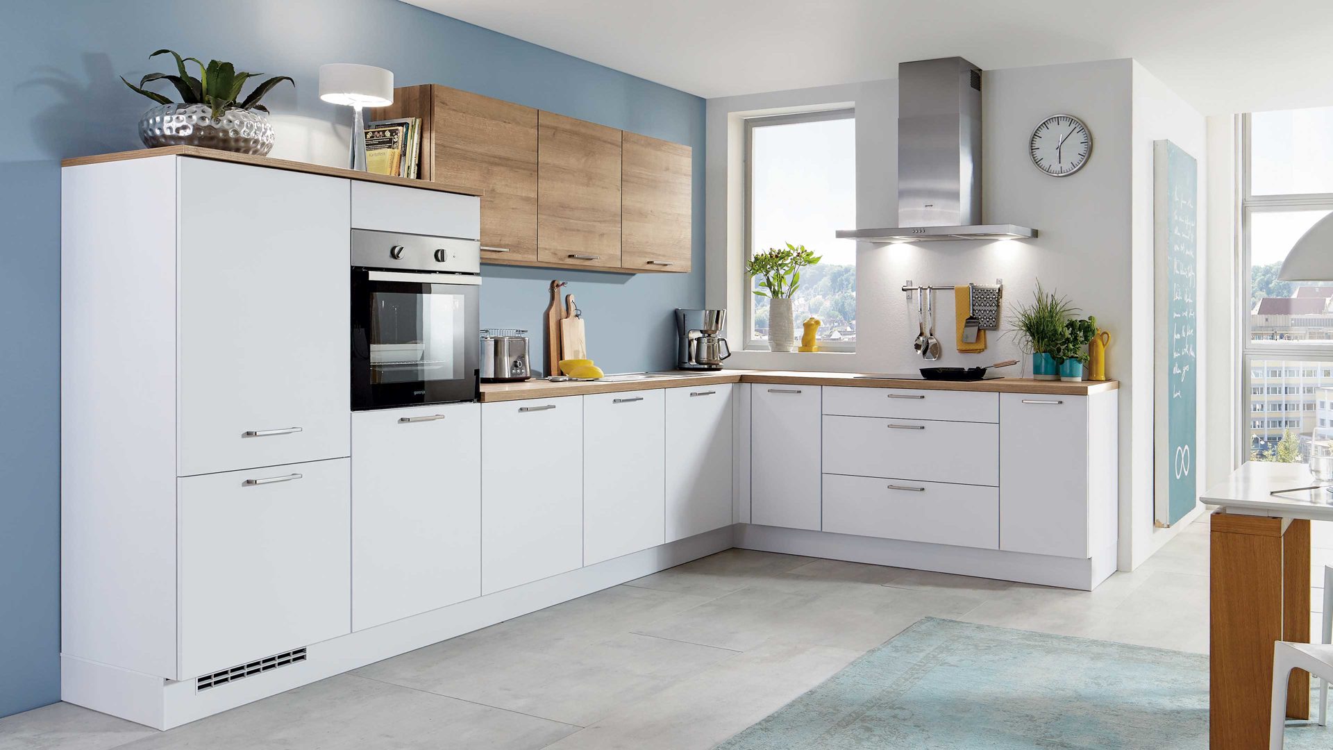 Freuen Sie sich auf entspanntes Kochen und Backen in der alpinweißen nobilia® Einbauküche Focus in L-Form mit Hochschrankkombination und inklusive privileg Elektrogeräten.