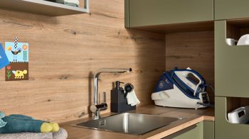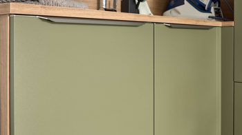 Die Interliving Küche Serie 3074 zeigt, dass auch ein Hauswirtschaftsraum mehr sein kann als nur Stauraum. Mit ihren softmatten olivgrünen Fronten strahlt sie Wärme und Natürlichkeit aus, während die authentische Vulkaneiche-Nachbildung an Sockelblenden, Regalen und Nischenverkleidung für wohnlichen Charakter sorgt. Dezente Metallgriffe runden das harmonische Gesamtbild im beliebten Natural-Living-Stil stilvoll ab.