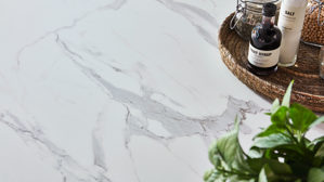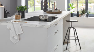 Arbeitsplatten und Ansetztisch in weißer Venato Bianco Marmor-Nachbildung