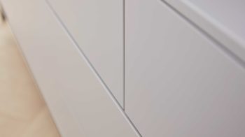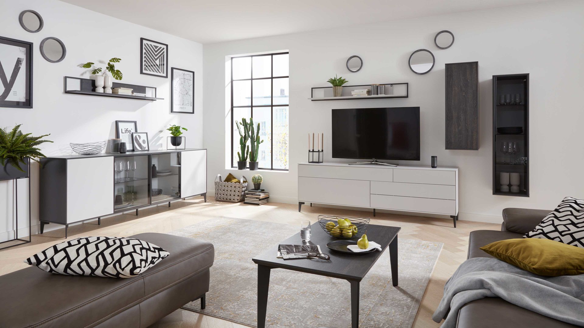 Auch die schwarzen und weißen Innenkorpusse sind melaminbeschichtet und damit besonders widerstandsfähig und pflegeleicht. Puristisch schieferschwarz pulverbeschichtete Design-Metallfüße runden die modernen Wohnmöbel stilsicher ab. Für das gewisse Etwas sorgen die Parsolglaseinsätze mit schieferschwarzem Aluminiumrahmen.
