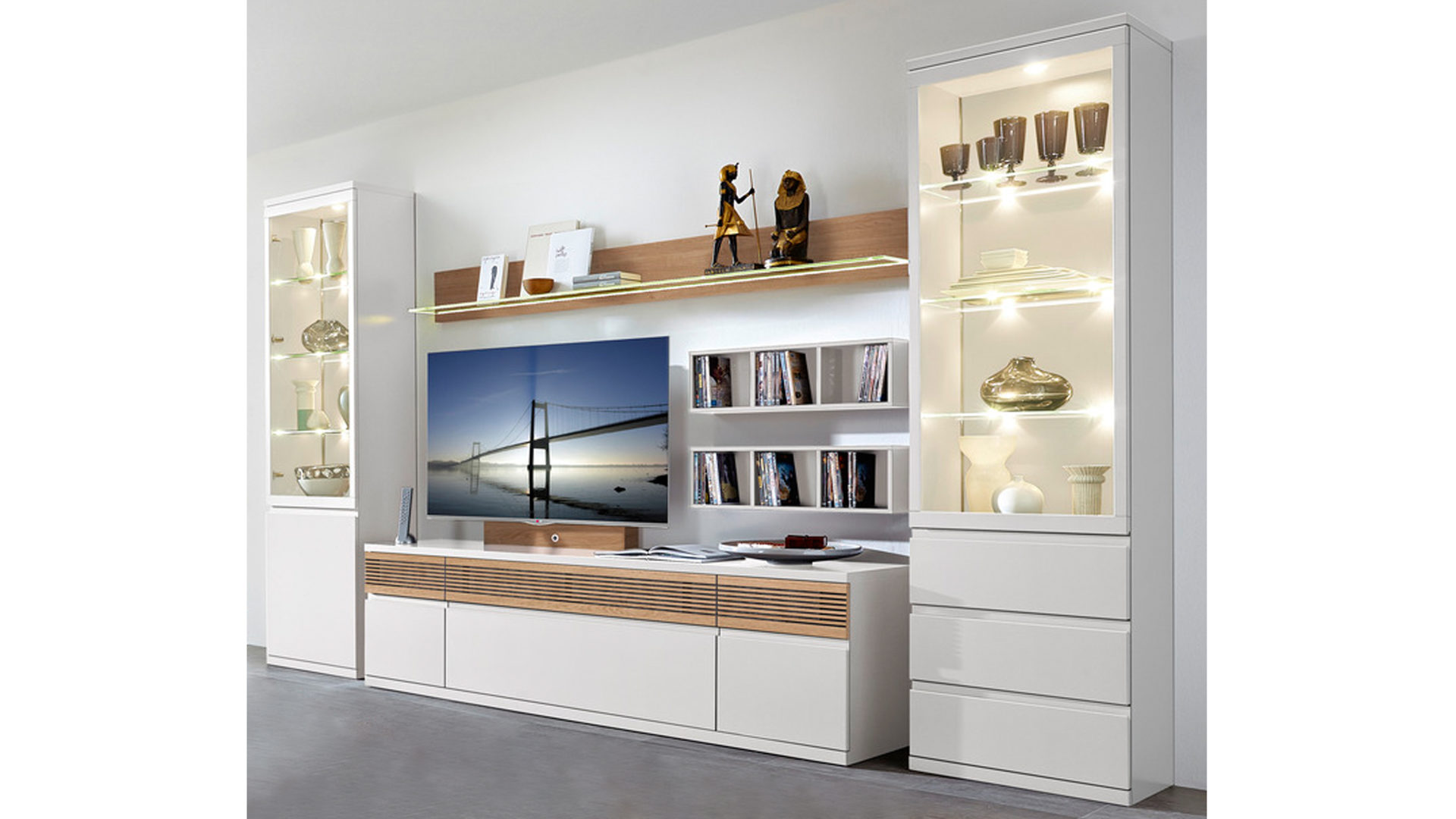 Die Vision Wohnkombination beeindruckt mit mattweißen Lackoberflächen und akzentuierendem Eichefurnier im Farbton Sand. Durch die helle Farbgebung strahlt die Wohnwand herrlich warmen, einladenden Charme aus. Speziell sind überdies die grifflosen Fronten. Zum Öffnen und Schließen der Türen, Klappen, Auszüge und Schubladen dienen unauffällige, praktische Griffleisten.