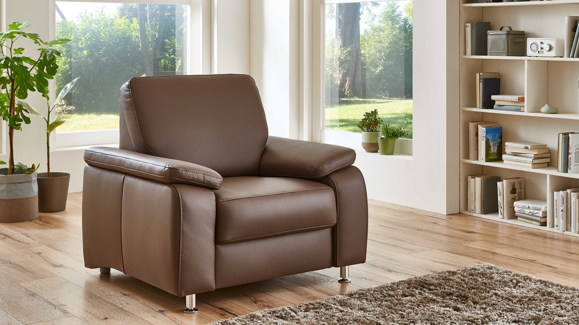 Der Polstersessel aus dem Modulmaster-Programm MM-PN1059 bringt moderne Eleganz und jede Menge Komfort in Ihr Wohnzimmer. Optisch begeistert der moccafarben pigmentierte Lederbezug. Matte Metallfüße runden das ansprechende Design stilsicher ab. Die Rückseite des Einzelsessels ist im Originalstoff bezogen.