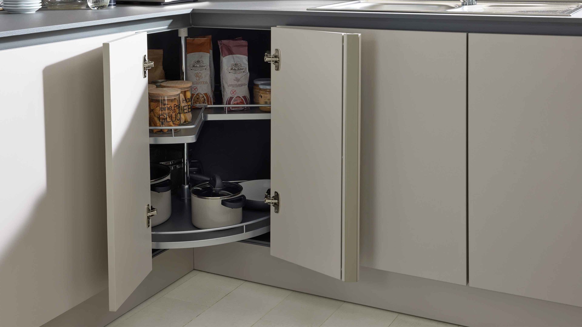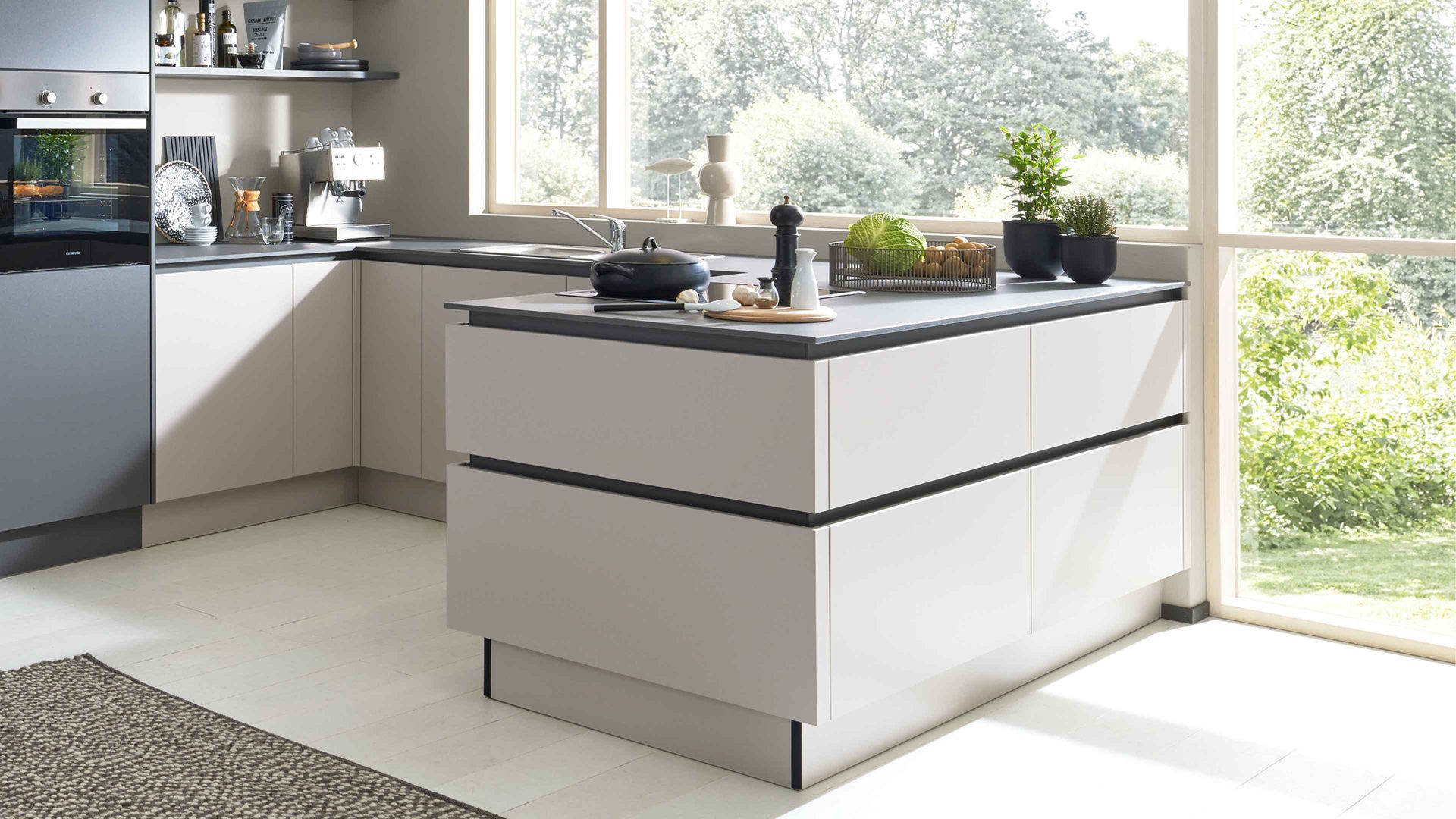 Interliving Küche Serie 3060 – elegante Systemküche in Sahara und Quarzgrau