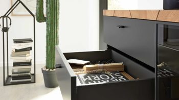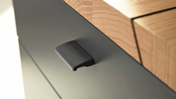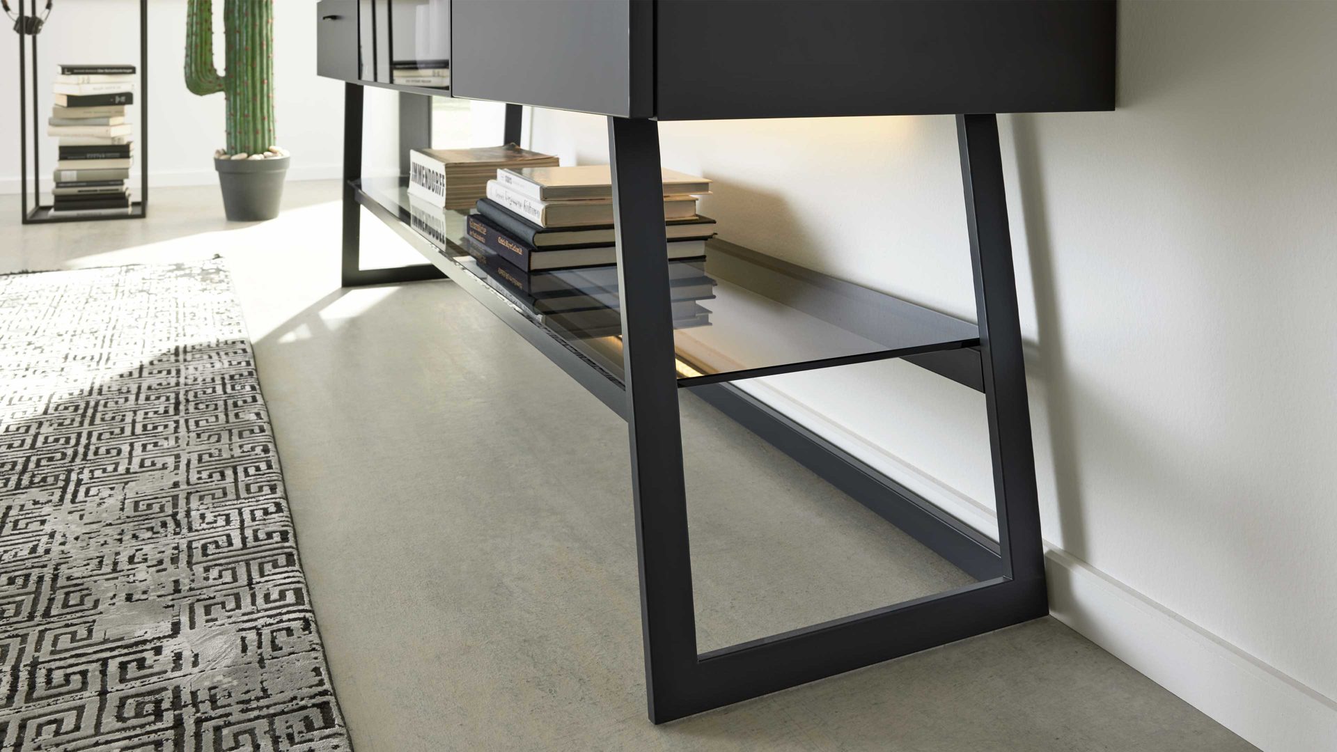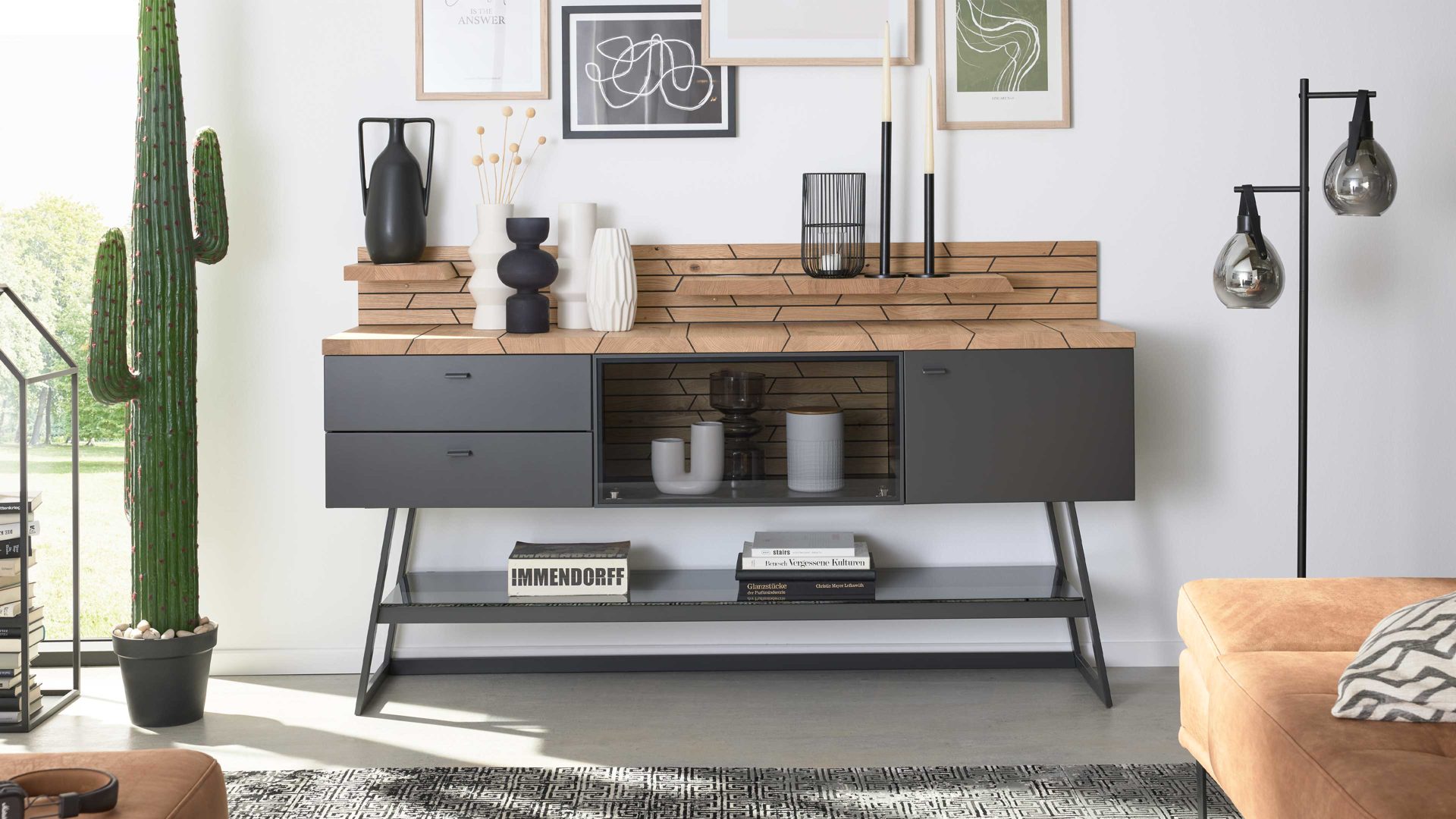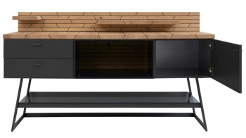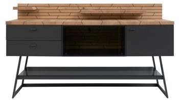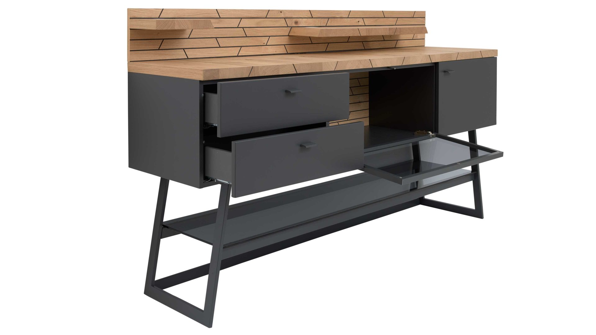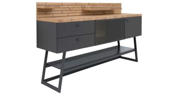 Dafür sorgt das Design aus geöltem Casa Wildeiche-Furnier in Kombination mit schiefer-schwarzem Mattlack und Parsolglas in Grau. Das ebenso schiefer-schwarze Metallgestell ergänzt die Optik harmonisch.