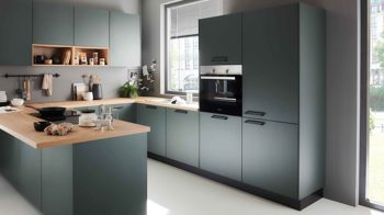 mattes Schwarz-Grün, kombiniert mit Chalet Eiche-Nachbildung, mattschwarzenBügelgriffen und graphitfarbenen Sockelblenden