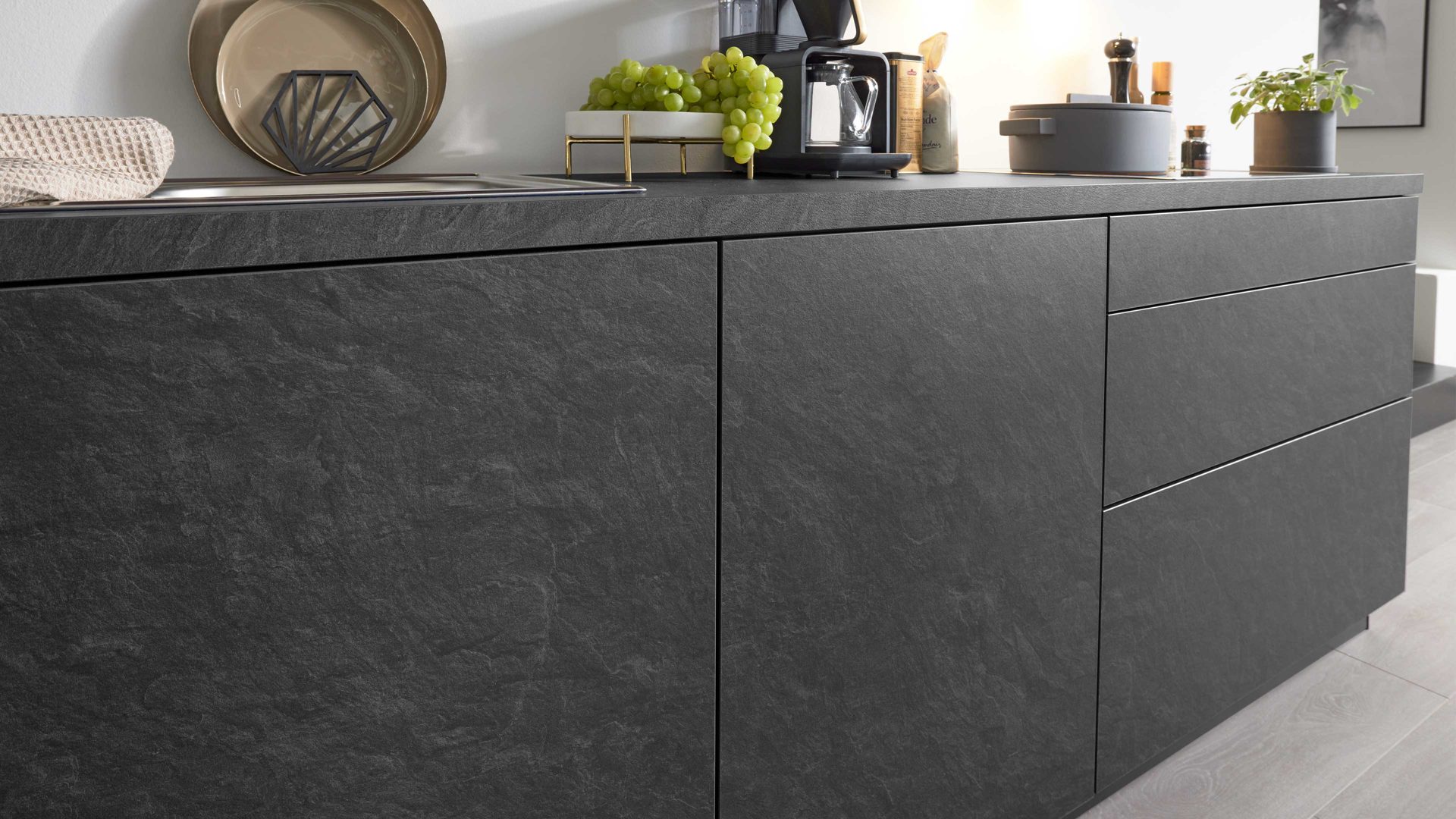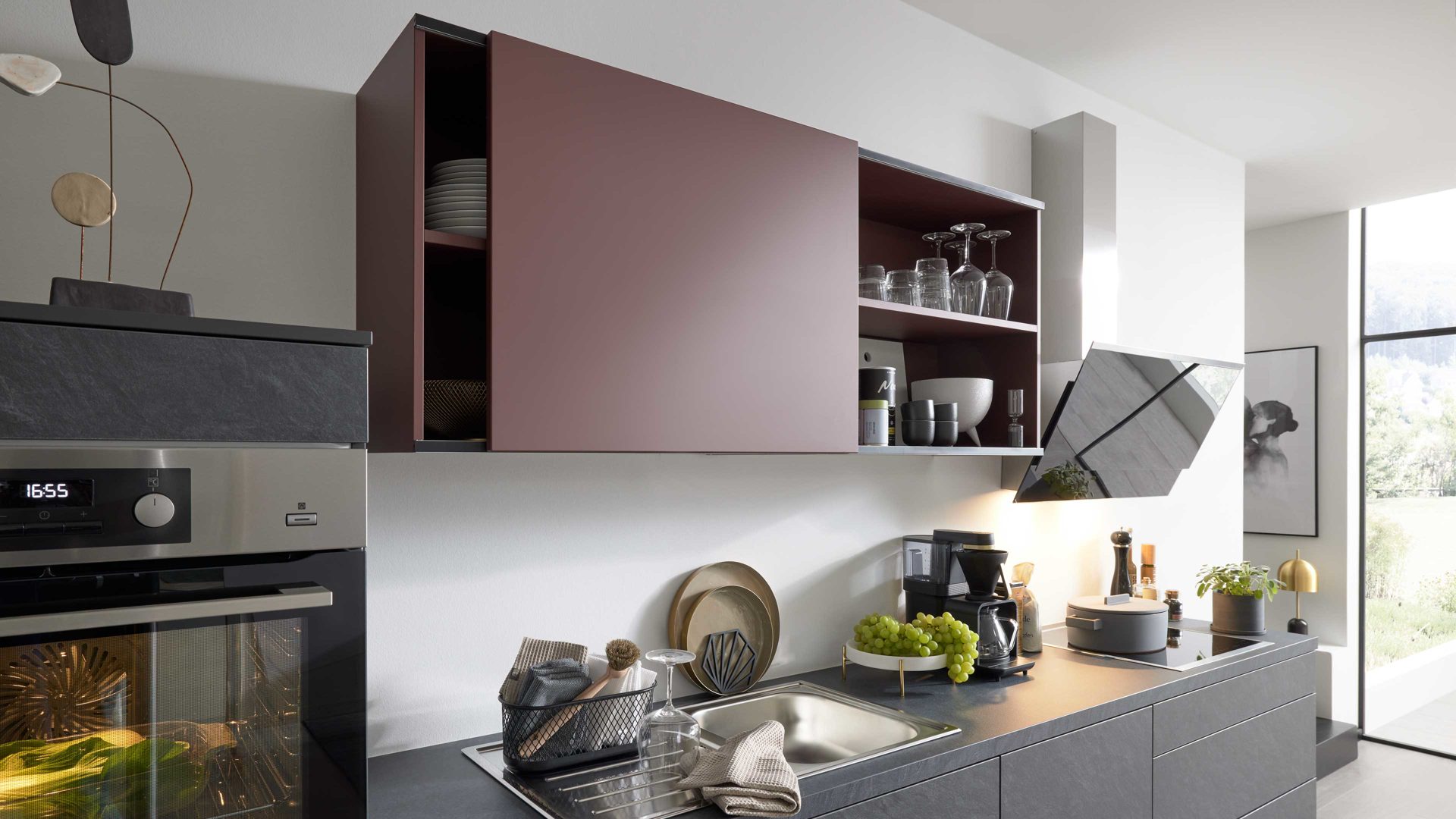 grifflose Fronten und Hängeschrank mit Schiebetür
