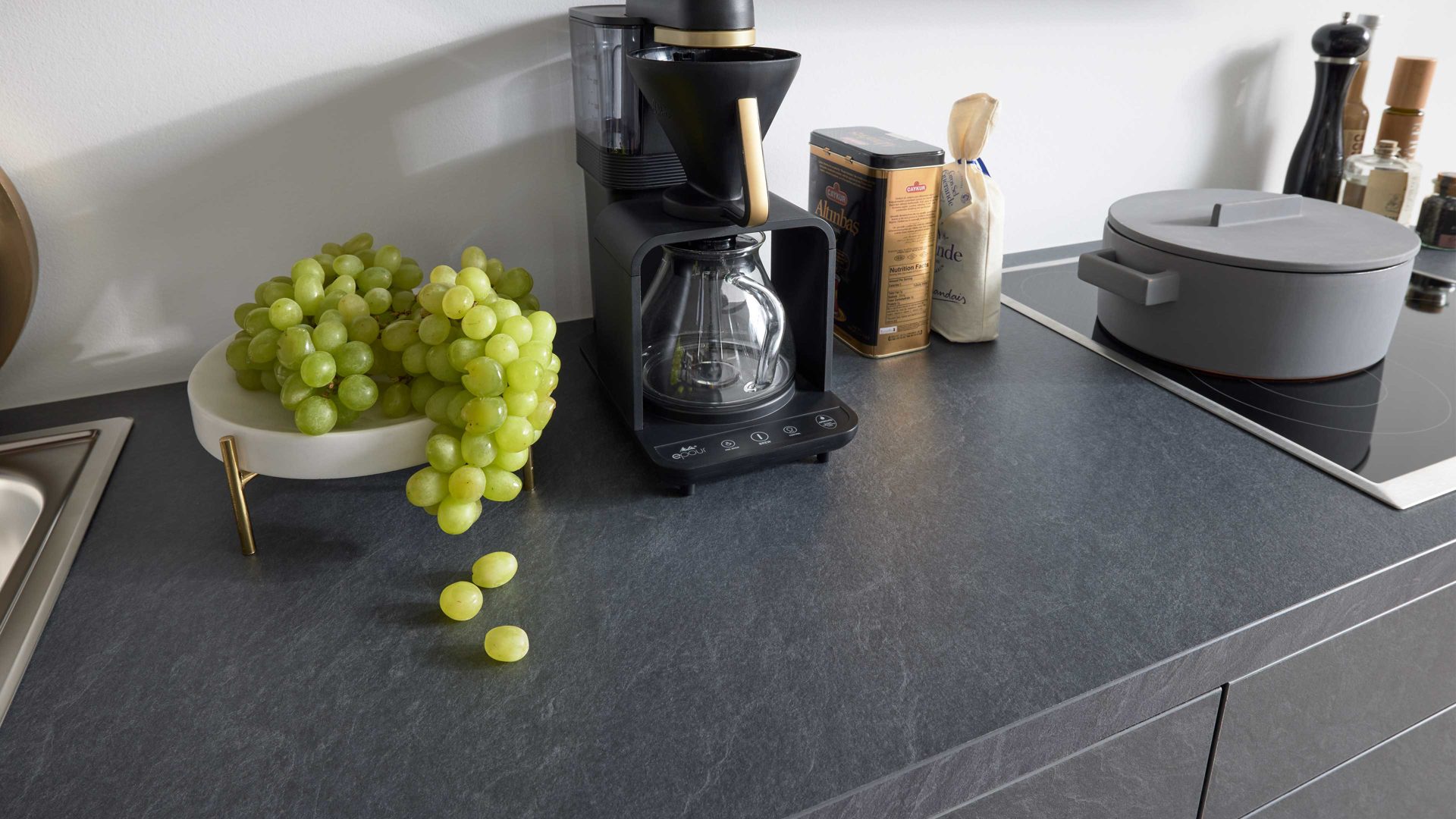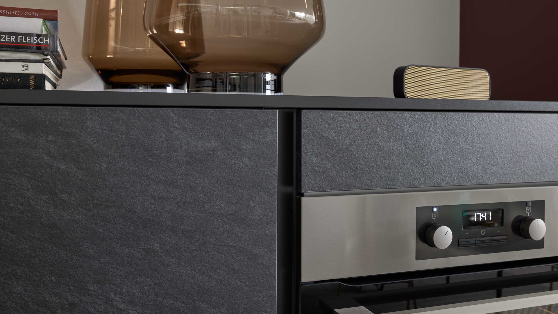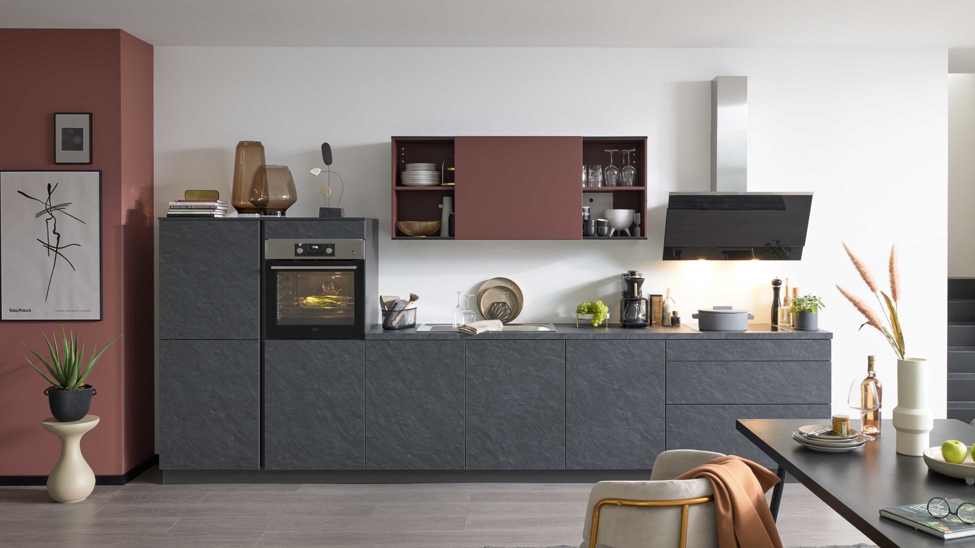 Alvaro Schiefer-Nachbildung, kombiniert mit samtmattem indischrotem Lack und lavaschwarzen Korpussen