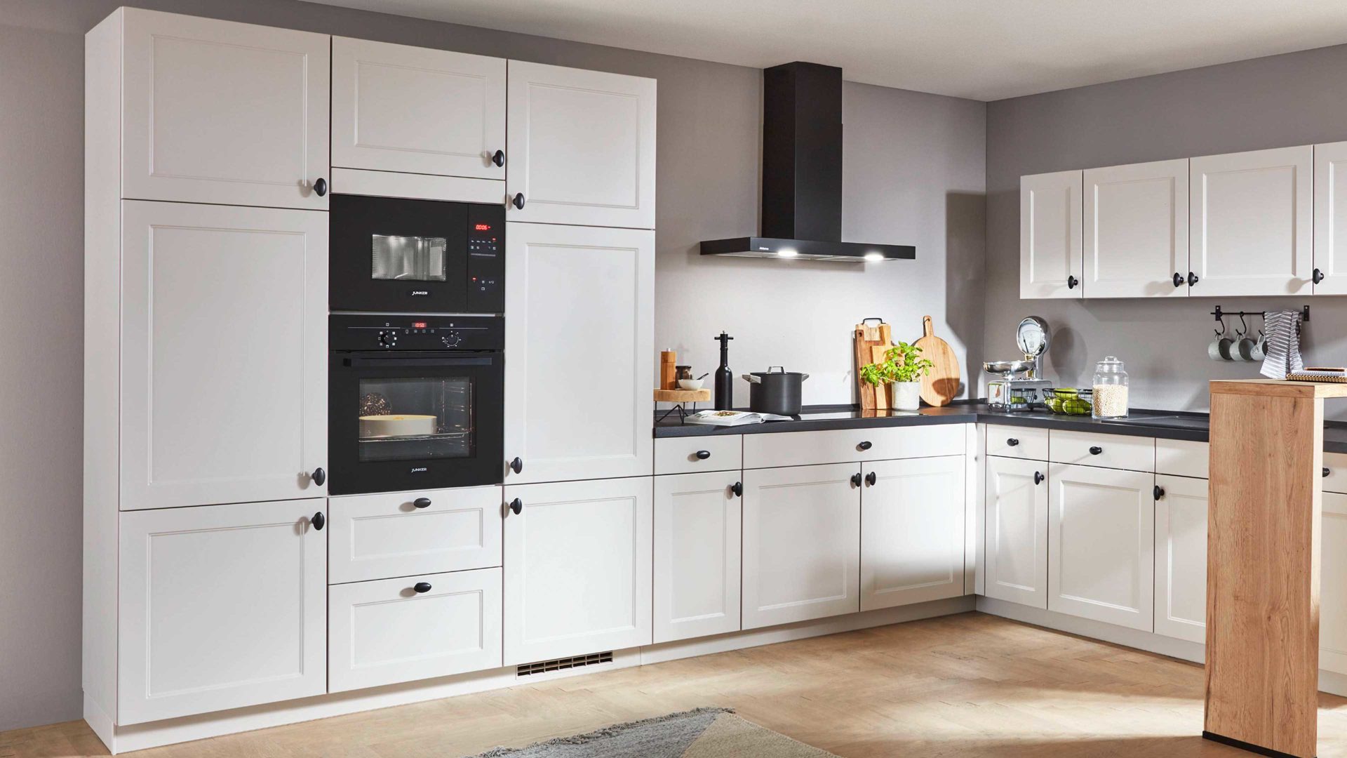 links Hochschränke für Backofen, Mikrowelle und Kühlschrank, viel Stauraum, Dunsthaube und Glaskeramik-Kochfeld