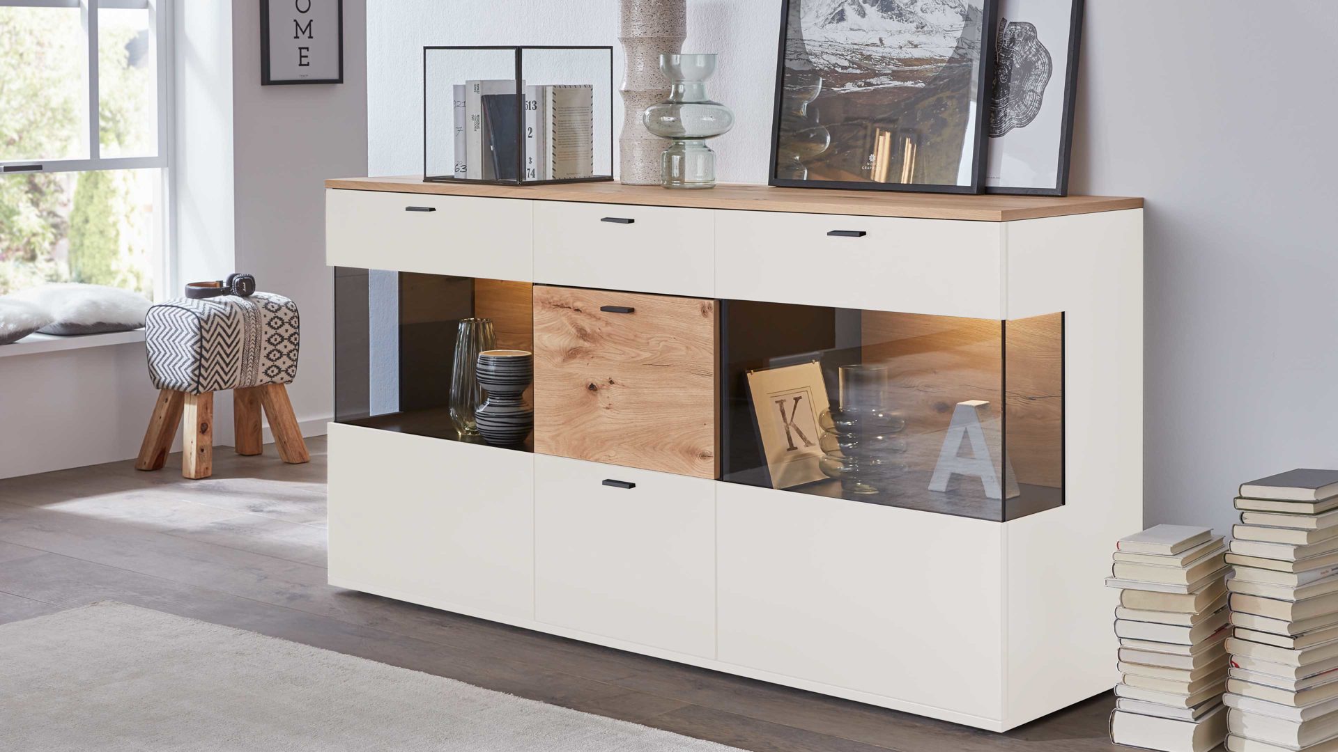 Sideboard Interliving-2104 Ausf. Lack weiß seidenmatt Akzent: Balkeneiche natur furniert Griff: anthrazit matt Vorzugskombination IL ...