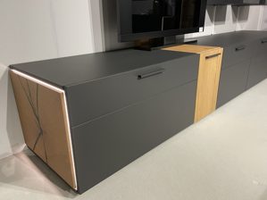 Das TV-Unterteil 1392L umfasst eine Schublade und misst ca. 91 x 50 x 55 cm (BxHxT). Als optischer Höhepunkt fungiert die Hirnholz-Applikation an der linken Außenseite. Das TV-Unterteil 1113L bildet den mittleren Teil der TV-Kommode. Ihre Tür ist links angeschlagen. Die Maße betragen ca. 32 x 50 x 55 cm (BxHxT). Das TV-Unterteil 1889R beherbergt drei Türen und ist auf der rechten Seite mit der Hirnholzapplikation versehen. Es misst ca. 181 x 50 x 55 cm (BxHxT). Mithilfe der zwei Distanzblenden 9996, die ebenfalls zum Lieferumfang gehören, lassen sich die drei TV-Unterteile zu einem kompletten TV-Möbel verbinden.