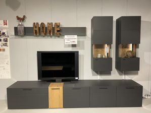 Die sechsteilige Wohnwand K066 aus der Interliving Wohnzimmer Serie 2023 besteht aus drei TV-Unterteilen, zwei Hängeelementen und einem Wandboard. Durch die Kombination aus carbongrauem Mattlack mit natur gebürstetem und lackiertem Salzkammergut-Eichefurnier strahlen die Wohnmöbel moderne Eleganz und gemütlichen Naturcharme aus. Für das gewisse Etwas sorgen Applikationen aus urwüchsigem Hirnholz. Haptisch gebürstete Aluminiumgriffe in Carbongrau und schwarze Kunststofffüße runden das stilvolle Design harmonisch ab. Die Gesamtmaße der Wohnkombination belaufen sich auf ca. 305 x 194 x 55 cm (BxHxT).