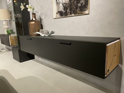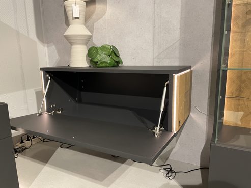 Das Hängeelement 1310 ist mit einer Klapptür ausgestattet. Seine Maße betragen ca. 92 x 32 x 38 cm (BxHxT). Als optisches Highlight fungieren die Hirnholz-Applikationen an den Außenseiten.