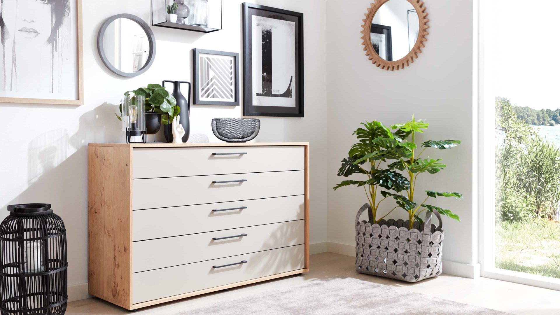 Weiß & Balkeneiche - fünf Schubladen, Breite ca. 124 cm