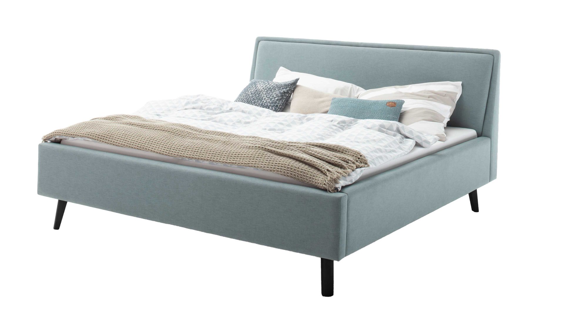 Das Polsterbettgestell Frieda mit Bettkasten verkörpert modernen Komfort. Mit dem eisblauen Stoffbezug und den schwarzen Holzfüßen präsentiert ...