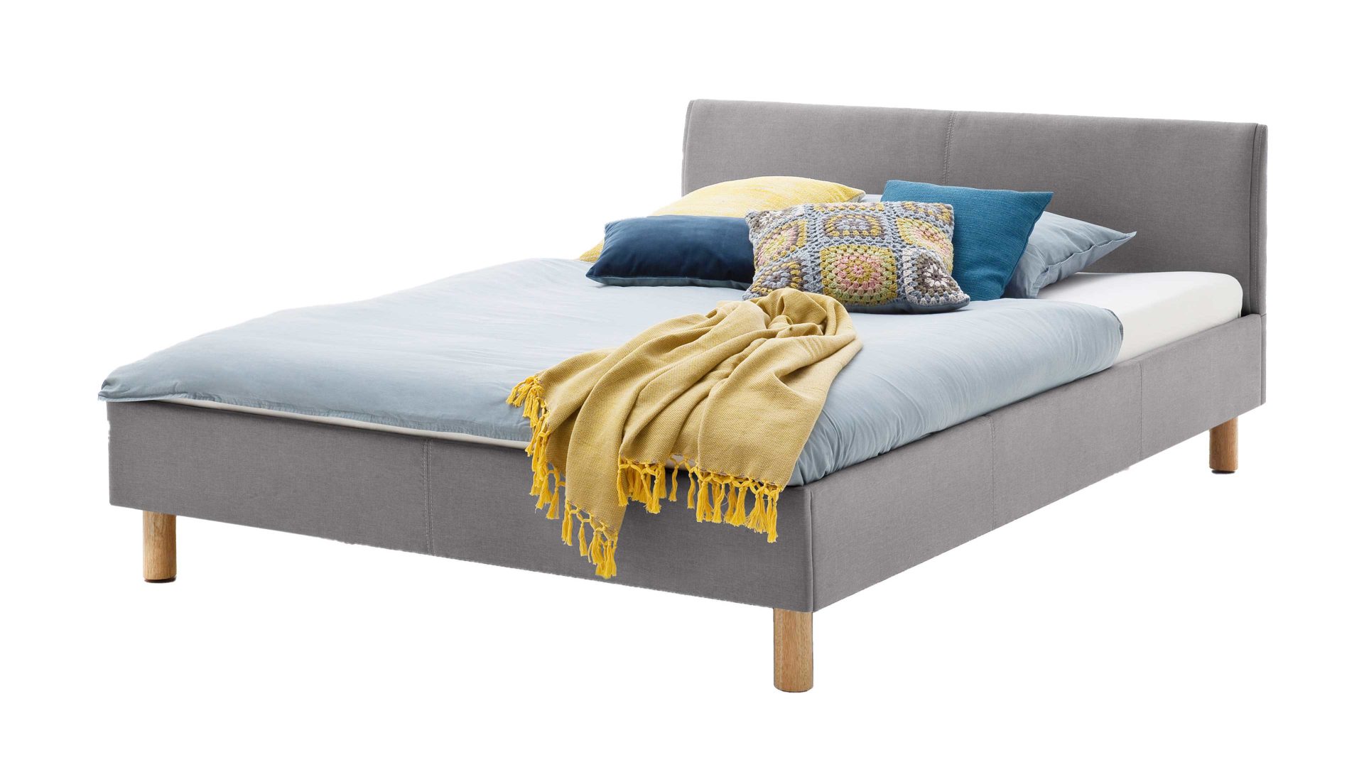Mit dem edlen hellgrauen Stoffbezug und den eichefarbenen Holzfüßen strahlt das Polsterbettgestell Lena klassische Eleganz mit einer Prise Natürlichkeit aus. Sowohl die Bettseiten als auch das bequeme Polsterkopfteil sind glatt bezogen, was den gemütlichen Charakter des Bettes unterstreicht. Das angenehm weiche Kopfteil ist beispielsweise beim Lesen oder Fernsehen als praktische Rückenlehne nutzbar.