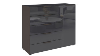 Die Kombination aus champagnerfarbenen Glasfronten und einem passenden Korpus in Champagner verleiht der Kommode eine edle, moderne Ausstrahlung. Schieferfarbene Metallgriffe setzen einen stilvollen Akzent und unterstreichen das harmonische Design. Im Inneren sorgt das silbergraue Streifendekor für ein hochwertiges, elegantes Finish.