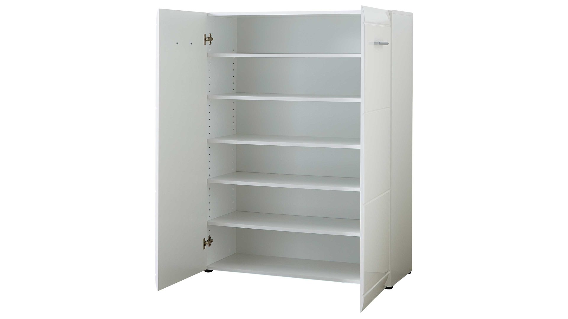 Verstauen Sie Ihre Schuhe staubfrei und ordentlich in diesem praktischen Schuhschrank in strahlendem Weiß. In Ihrer Diele sorgt diese Art der Schuhaufbewahrung jederzeit für Ordnung, denn Sie bietet ausreichend Platz für etwa 20 Paar Schuhe, die Sie dadurch stets griffbereit haben. Bringen Sie Ihre Sandalen, Sneaker oder Halbschuhe in diesem formschönen und zeitlosen Schuhschrank unter, der über eine Doppeltür und fünf Einlegebögen verfügt und damit wunderbar unkompliziert in der Handhabung ist.