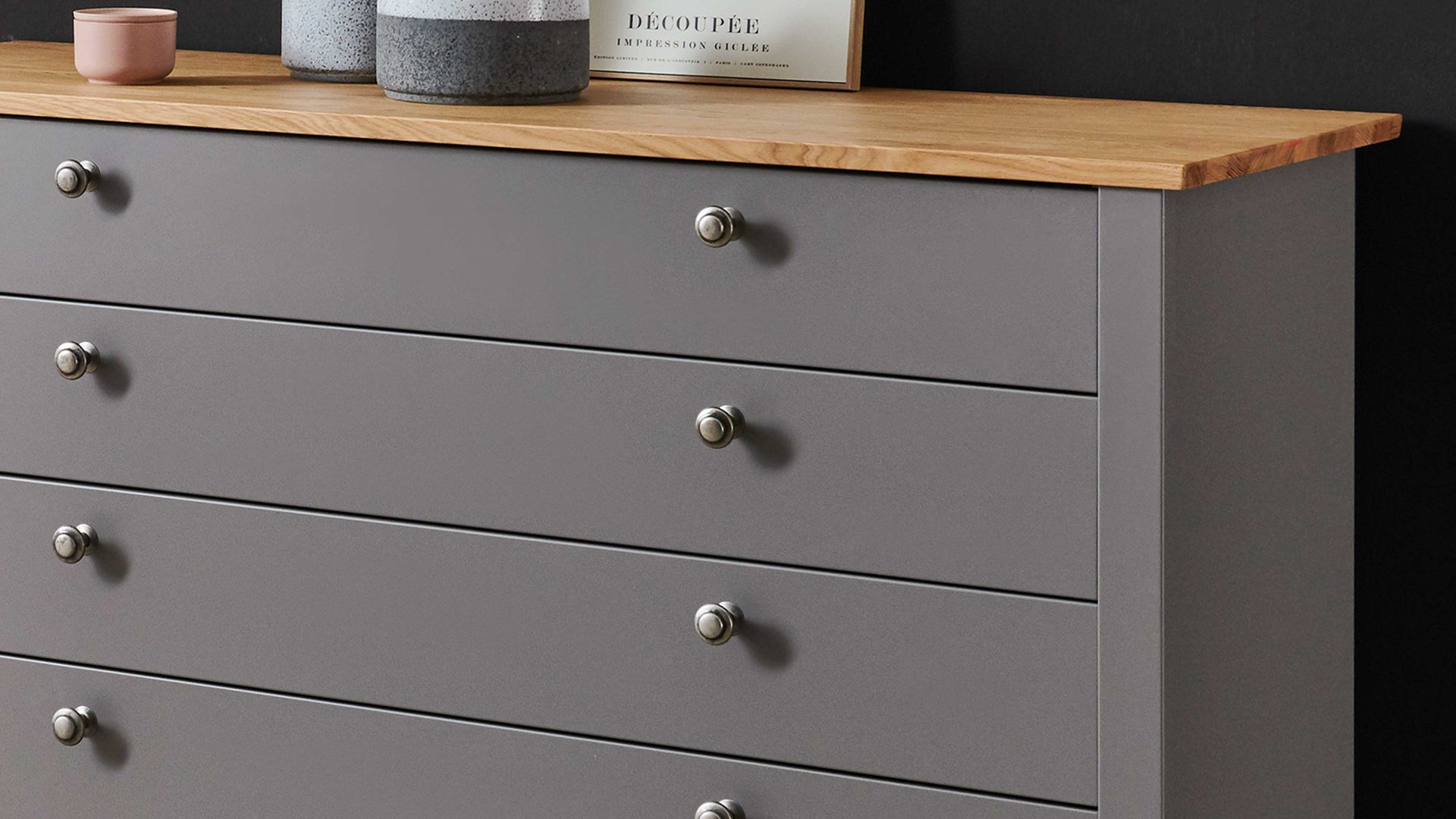 Die mattnickelfarbigen Knopfgriffe Nr. 90985 ergänzen das Design des Kommodenschranks perfekt und sorgen für eine harmonische Gesamtoptik. Mit den fünf Schubladen, die über Teilauszug und Softclose-Funktion verfügen, haben Sie genügend Stauraum für Ihre Kleidung und Accessoires. Der Selbsteinzug ermöglicht ein bequemes Öffnen und Schließen der Schubladen.