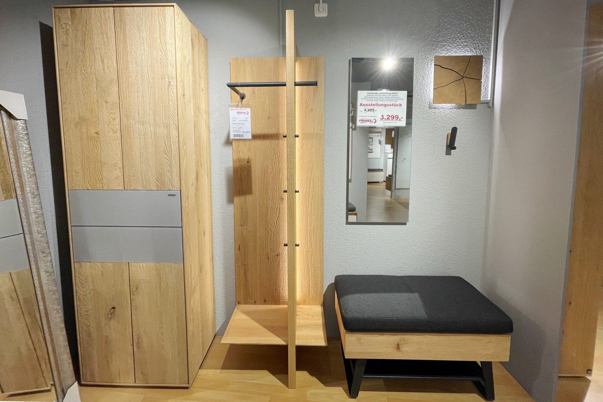 Garderobe Interliving-6004 Kerneiche massiv, natur gebürstet Riffholzapplikationen Absatz: naturgraues Mattglas Vorschlag 102 B= ca. ...