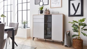Eine optisch wie funktional begeisternde Eigenschaft der Kommode bilden die grifflosen Fronten mit Push-to-open-Funktion und Türdämpfung. Letztere ermöglicht lautloses Schließen. Den gleichen Vorteil haben die Schubladen: Sie sind mit einer Schließdämpfung ausgestattet. Des Weiteren bringen sie einen praktischen Selbsteinzug mit, der die Handhabung spürbar erleichtert. Die Maße des geräumigen Kommodenschranks belaufen sich auf ca. 143 x 121 x 37 cm (BxHxT). Er beherbergt eine Glas- und zwei Holztüren mit insgesamt zwei Glas- und drei Holzböden sowie zwei flache Schubladen.