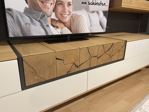 Attraktive Akzente setzen das Low- und das Wandboard mit den puristisch-weißen Mattlackfronten und Details aus schieferschwarz pulverbeschichtetem Metall sowie das Lowboard und die Hängevitrine mit den massiven Hirnholzapplikationen. Diese Charakteristika verleihen den Möbeln wie der gesamten Wohnkombination das gewisse Etwas und ziehen die Blicke auf sich.