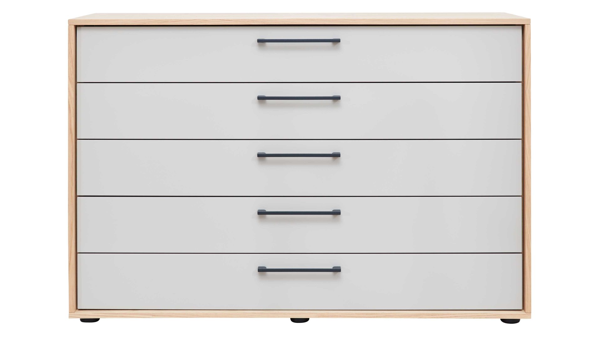 Mit Maßen von ca. 124 x 82 x 46 cm (B/LxHxT) bietet sie großzügigen Stauraum. Die fünf Schubladen sind mit Selbsteinzug und Soft-Abstoppung ausgestattet, was für ein angenehm leises und komfortables Schließen sorgt. Jede Schublade ist zudem bis maximal 20 kg belastbar, sodass du Kleidung, Wäsche oder Accessoires sicher und ordentlich verstauen kannst. Der innen weiß lackierte Korpus sorgt für eine helle, saubere Innenoptik.