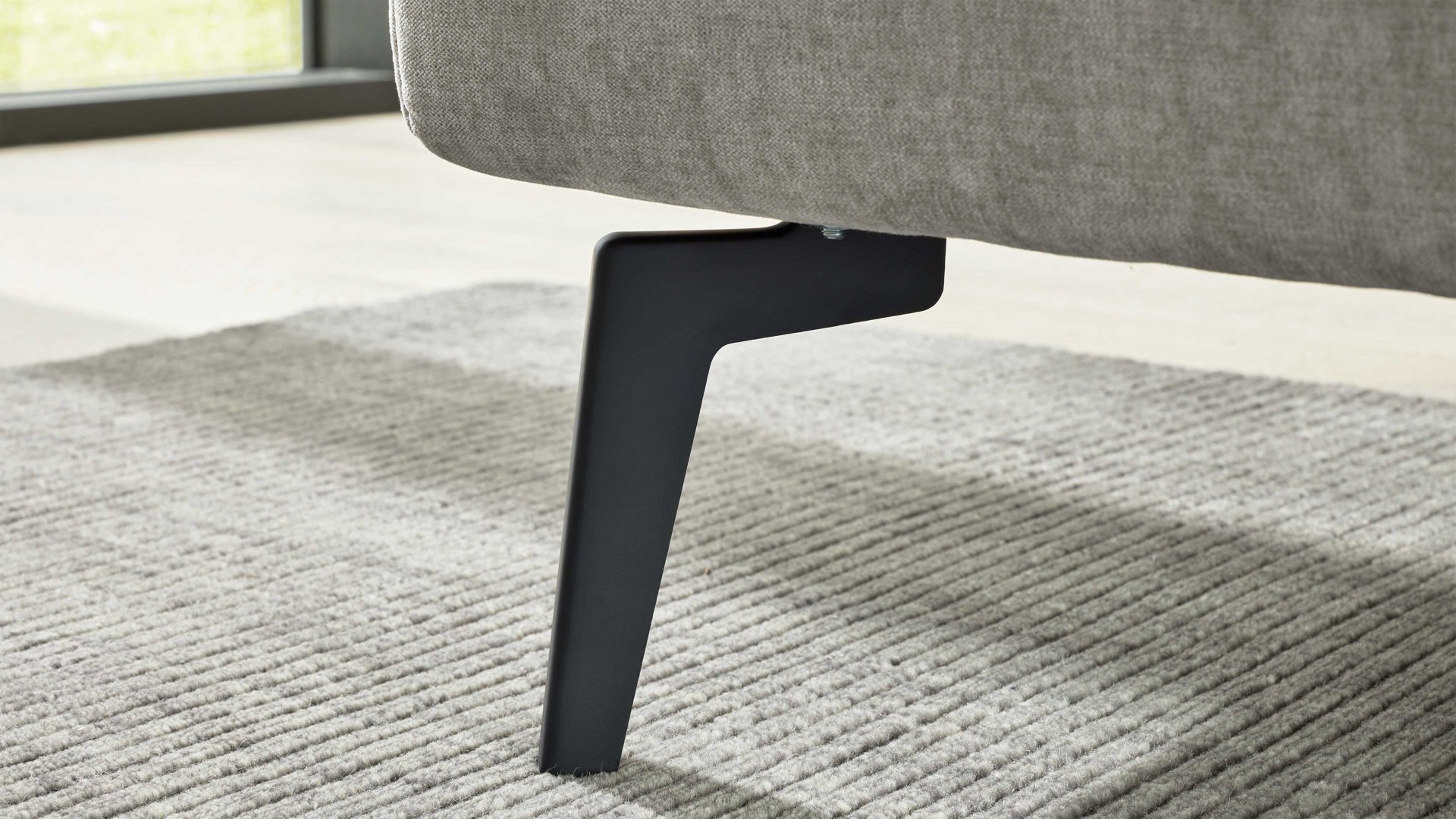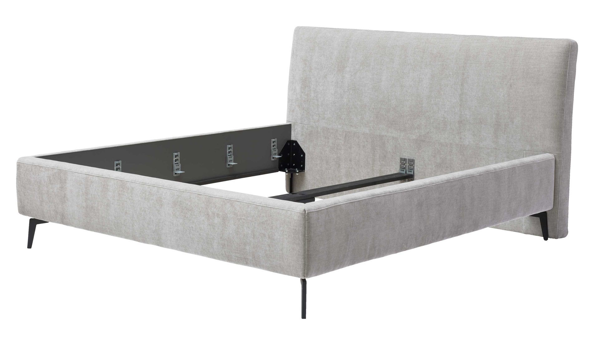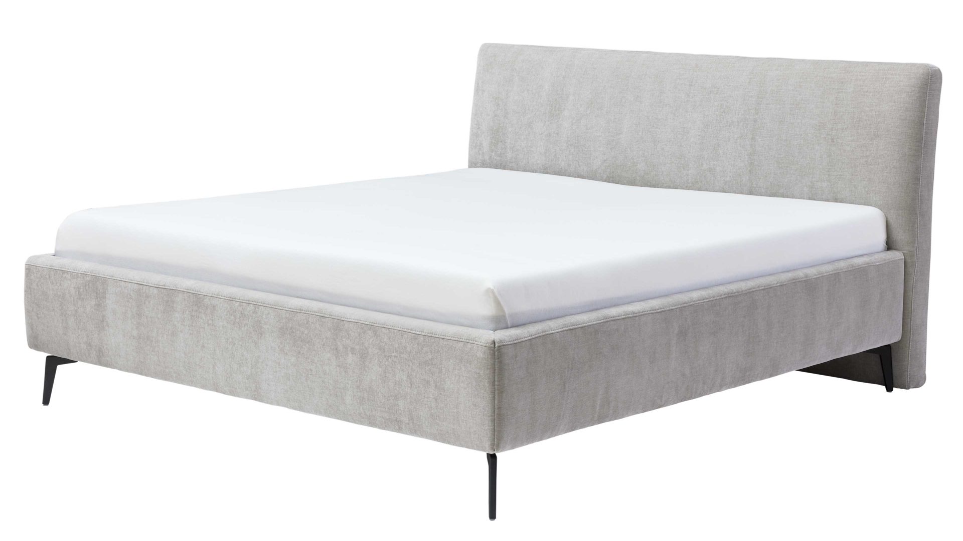 Die kubisch gepolsterten Bettseiten mit anthrazitfarben lackierter Innenseite bilden einen stilvollen Kontrast zum Stoffbezug und werden durch die schwarzen Metallfüße elegant ergänzt. Für individuelle Gestaltung stehen vier weitere Fußvarianten in zwei Höhen zur Auswahl.