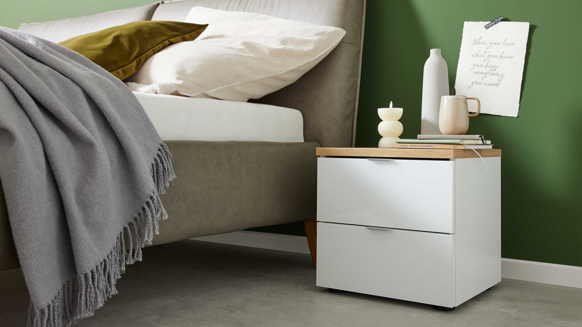Die zwei Schubladen der Nachtkommode überzeugen durch ihren Softeinzug, der besonders leises Schließen ermöglicht – ideal für entspannte Abende und ruhige Nächte. Praktisch ist auch, dass der Nachtschrank bereits fertig montiert geliefert wird. Mit Maßen von ca. 40 x 41 x 40 cm (BxHxT) passt das kompakte Möbel perfekt neben dein Bett und bietet Platz für alles, was du griffbereit haben möchtest.
