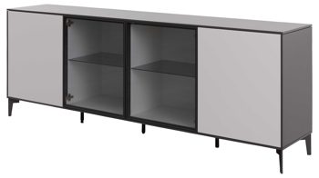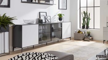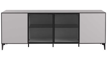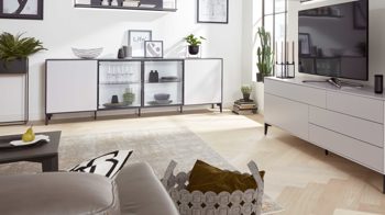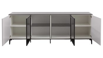 Eine optisch wie funktional begeisternde Eigenschaft des Sideboards bilden die grifflosen Fronten mit Push-to-open-Funktion und Türdämpfung. Letztere ermöglicht lautloses Schließen. Die Maße des geräumigen Schranks belaufen sich auf ca. 243 x 86 x 47 cm (BxHxT). Er beherbergt jeweils zwei Holz- und Glastüren mit insgesamt zwei Holz- und zwei Glasböden.