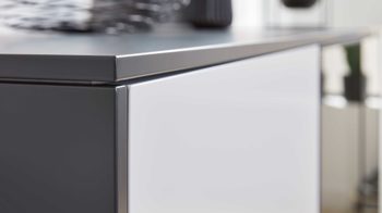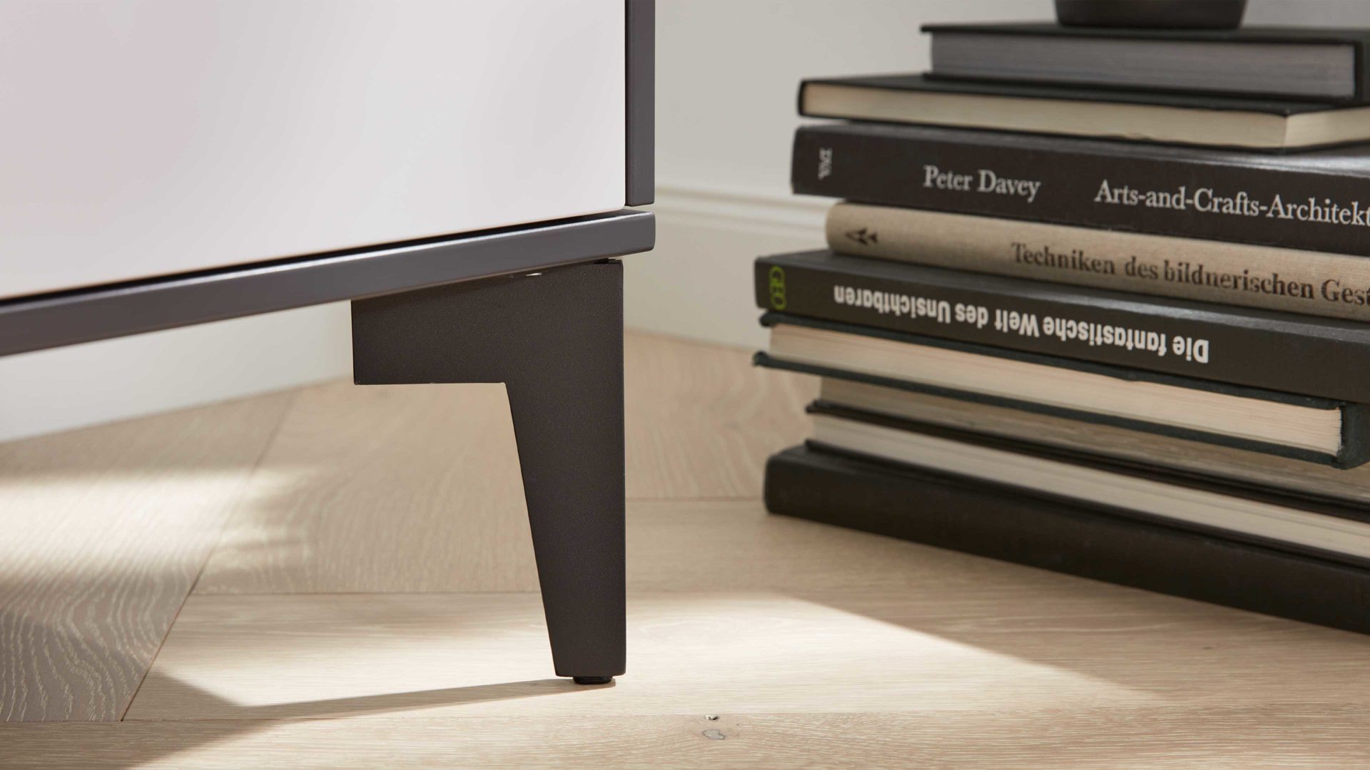 Der weiße Innenkorpus ist melaminbeschichtet und damit besonders widerstandsfähig und pflegeleicht. Puristisch schieferschwarz pulverbeschichtete Design-Metallfüße runden die moderne Kombikommode stilsicher ab. Für das gewisse Etwas sorgen die Parsolglaseinsätze mit schieferschwarzem Aluminiumrahmen.