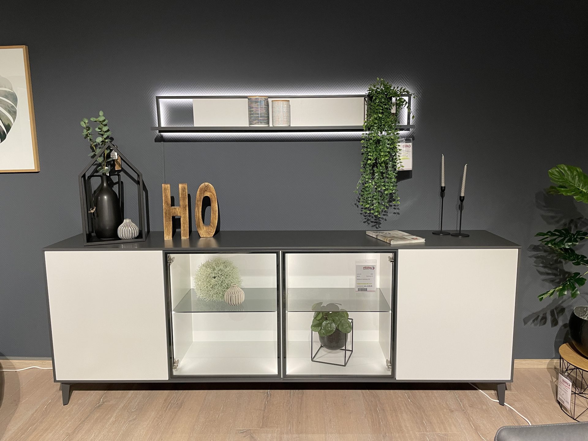 Das Sideboard 660821 aus der Interliving Wohnzimmer Serie 2107 kombiniert quarzgraue Mattlackfronten mit einem schieferschwarzem Mattlack-Korpus.